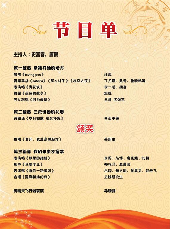 南京航空航天大学“感恩·远航”第三届“良师益友—我最喜爱的导师”颁奖典礼暨2012届研究生毕业联欢会将于二零一二年三月二十六日(周一)晚7:00在明故宫新大学生活动中心举行。