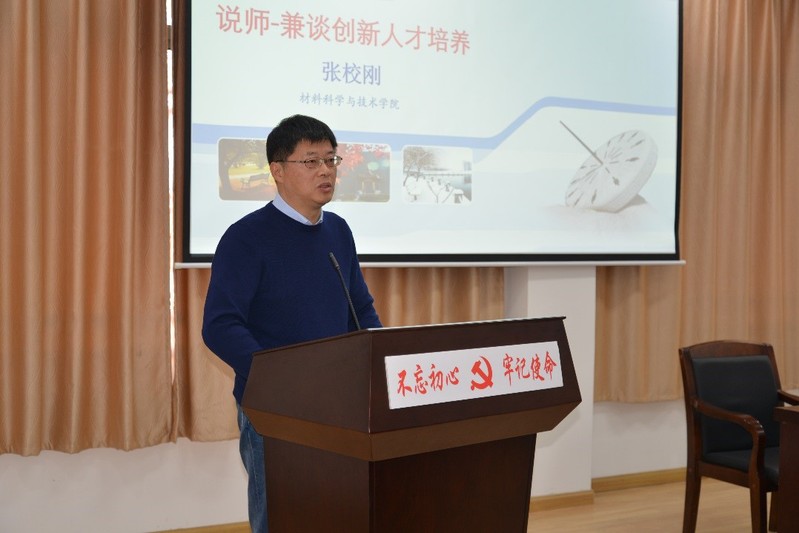 材料科学与技术学院院长张校刚教授随后做了题为“说师-兼谈创新人才培养”的专题报告。张教授从Nature关于好导师的标准和杰出导师奖获得者培养人才的做法入手,结合自己多年带研究生的体会和感悟,提出导师指导研究生应遵循的基本原则和建议。张教授还从选题、科研的系统性、科研的创新性、科研的独立性、科研的深度五个方面分享了自己对于创新人才培养的思考。