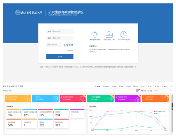 新版研究生管理信息系统基于高校教育等级保护3级的标准开发,涵盖研究生招生、培养、毕业、学位、研工与评估等各个管理环节,在系统运行性能、安全性等方面具有显著优势。系统可提供研究生培养过程的个性化自定义数据统计分析,实现对研究生培养全过程的学业智能预警与质量监控,实现研究生培养全过程数据流畅通、与相关业务部门之间的数据交汇对接共享,并结合我校i南航APP,首次推出研究生信息管理移动终端服务。