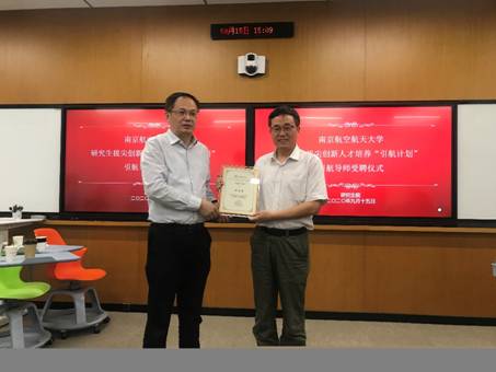 座谈会最后,进行了引航导师受聘仪式。张启钱为陈忠贵颁发了南京航空航天大学研究生拔尖创新人才培养“引航计划”引航导师聘书。