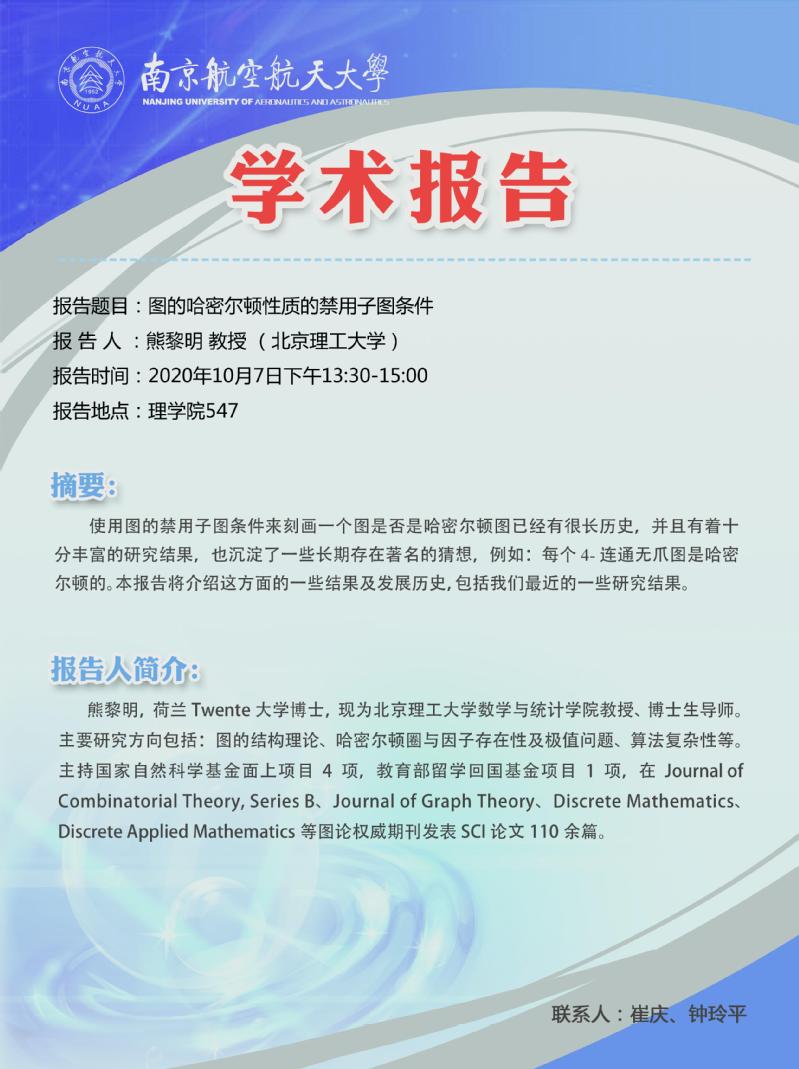 报告题目:图的哈密尔顿性质的禁用子图条件