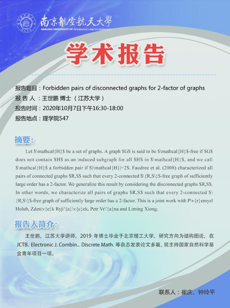 报告题目:Forbidden pairs of disconnected graphs for 2-factor of graphs