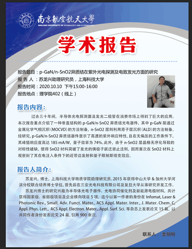 报告题目:p-GaN/n-SnO2异质结在紫外光电探测及电致发光方面的研究