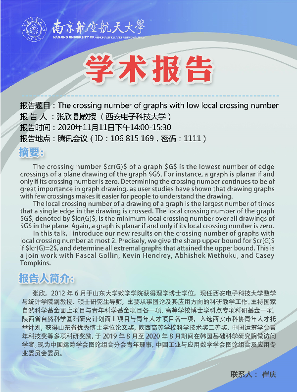 报告题目:The crossing number of graphs with low local crossing number
