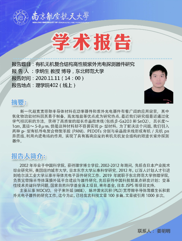 报告题目:有机无机复合结构高性能紫外光电探测器件研究