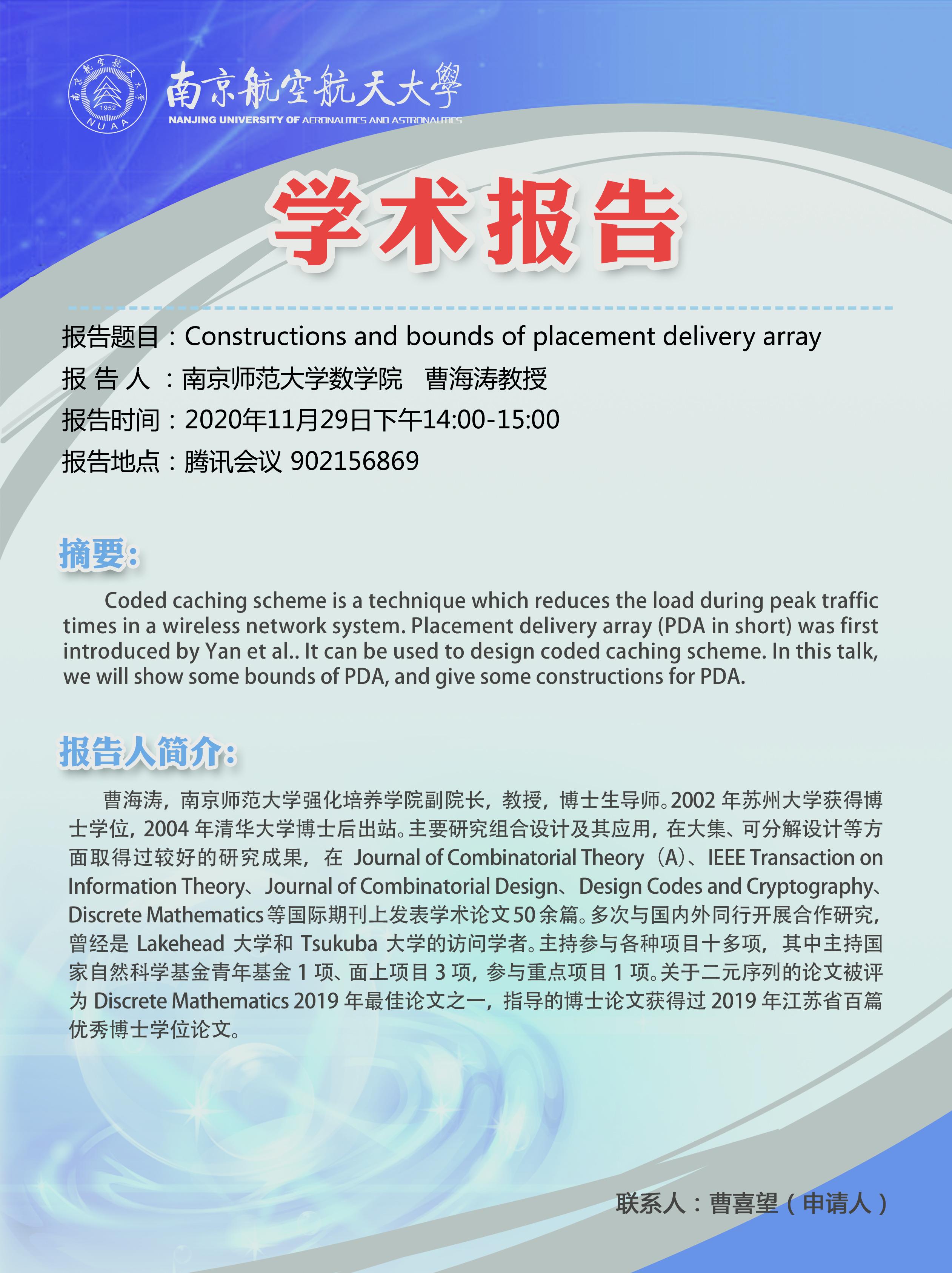 报告题目:Constructions and bounds of placement delivery array