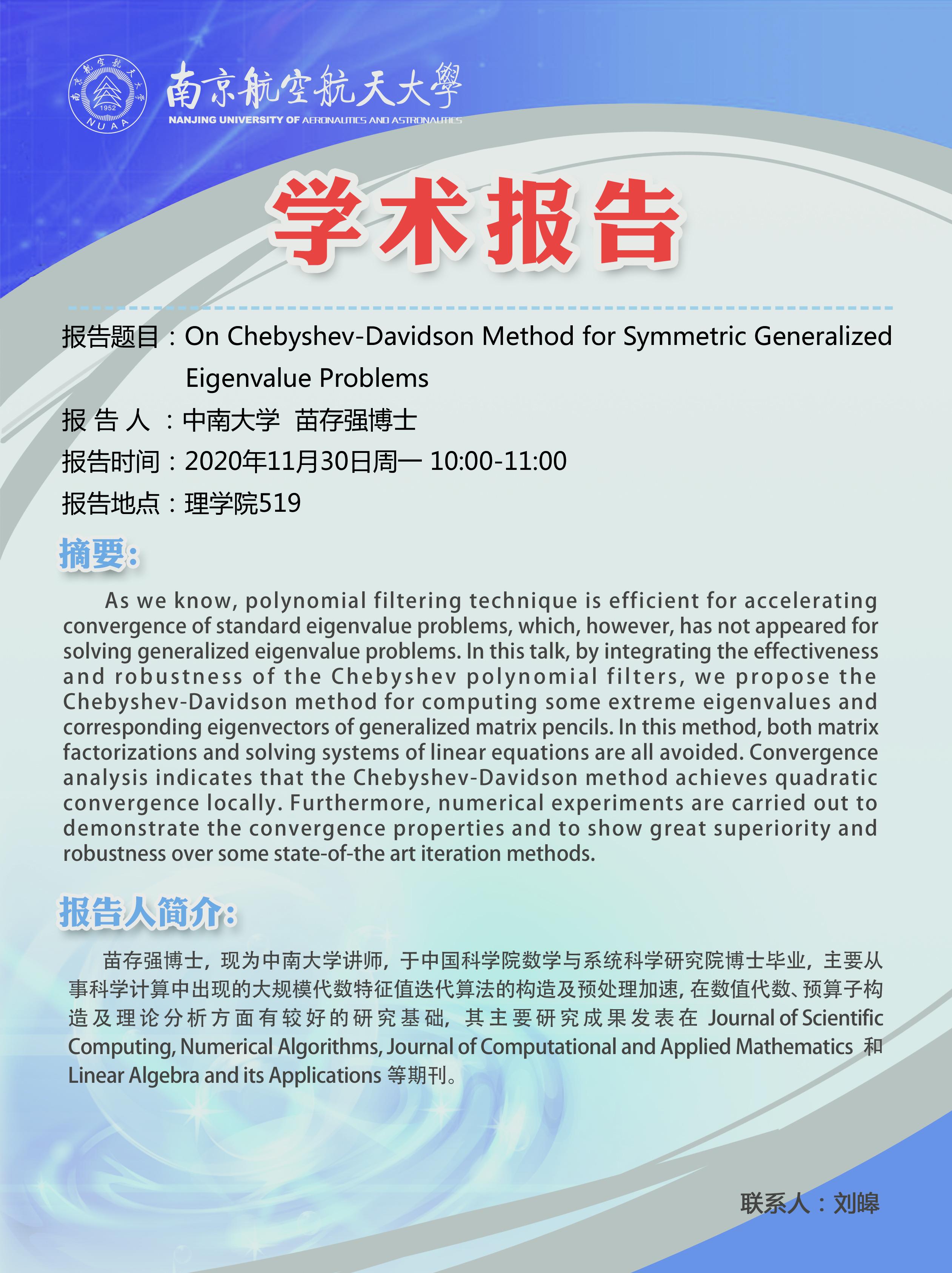报告题目:On Chebyshev-Davidson Method for Symmetric Generalized Eigenvalue Problems