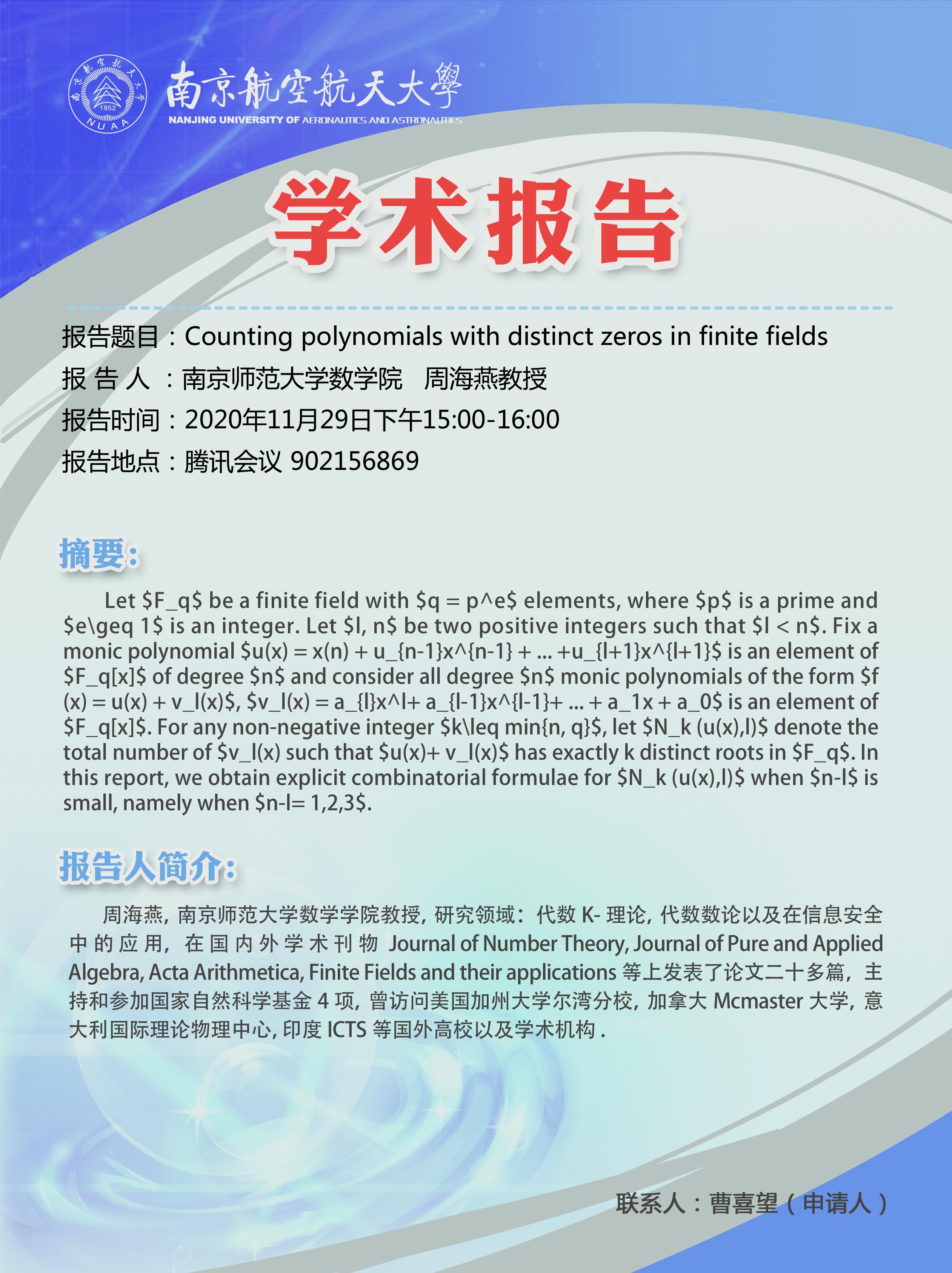 报告题目:Counting polynomials with distinct zeros in finite fields