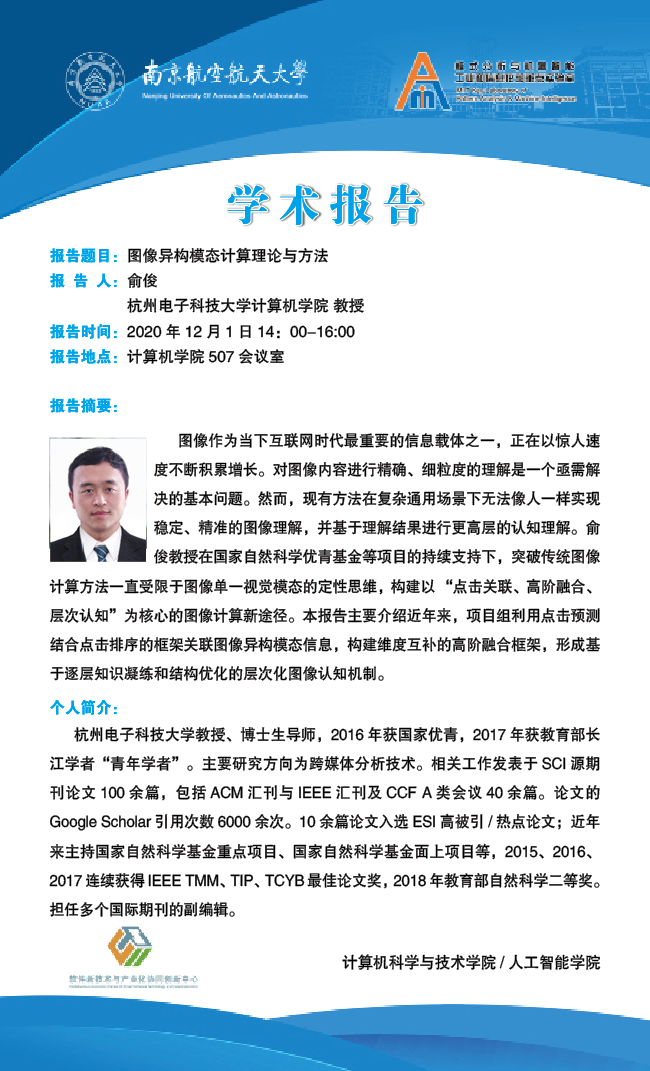 报告人:俞俊 教授(杭州电子科技大学)