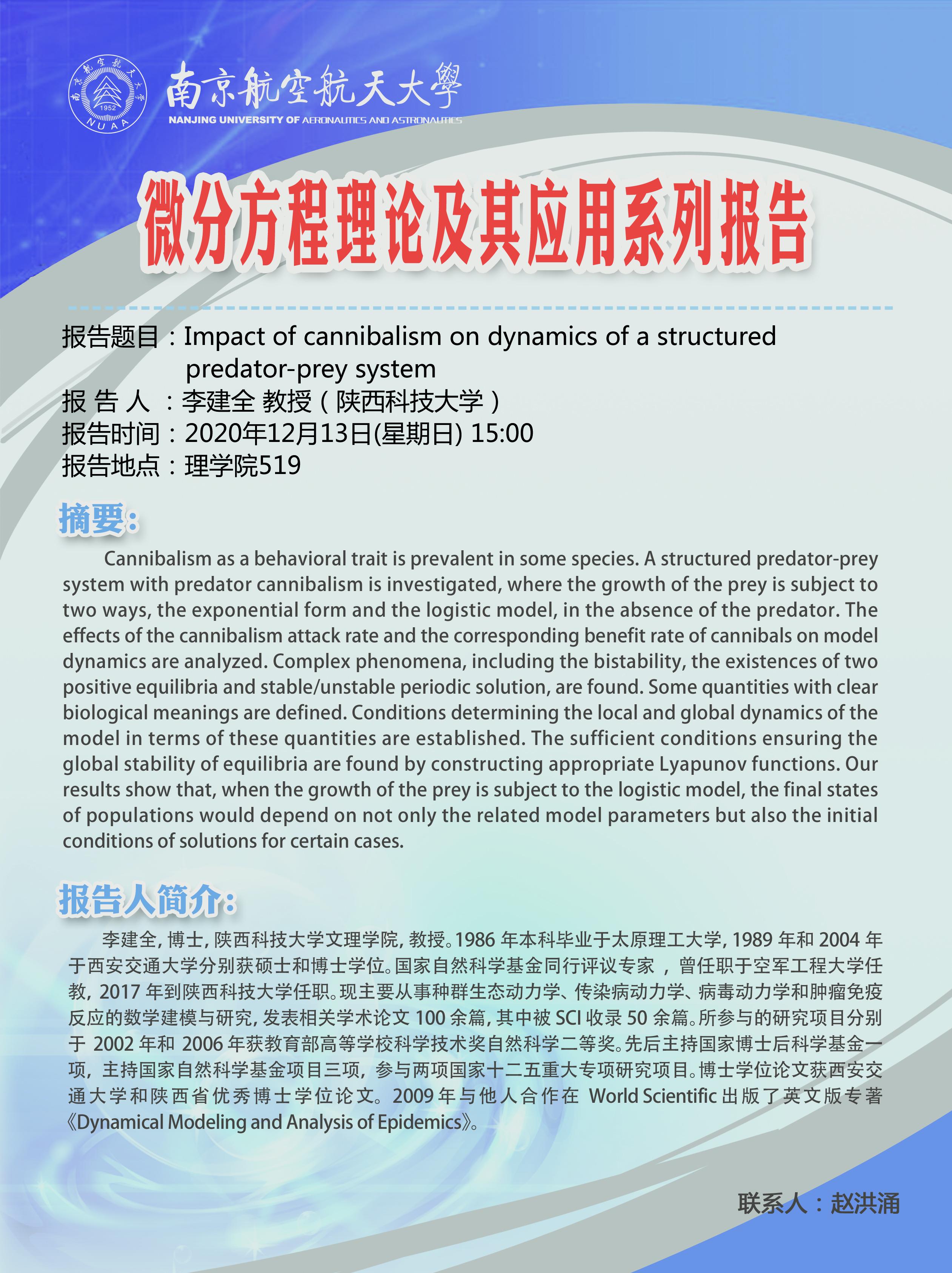 报告题目:Impact of cannibalism on dynamics of structured predator-prey system