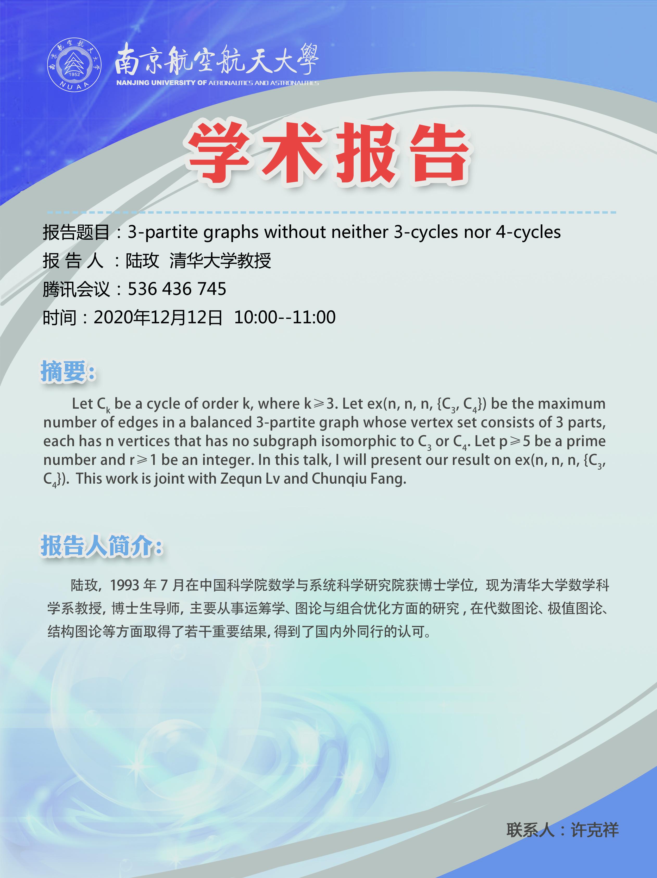 报告题目:3-partite graphs without neither 3-cycles nor 4-cycles