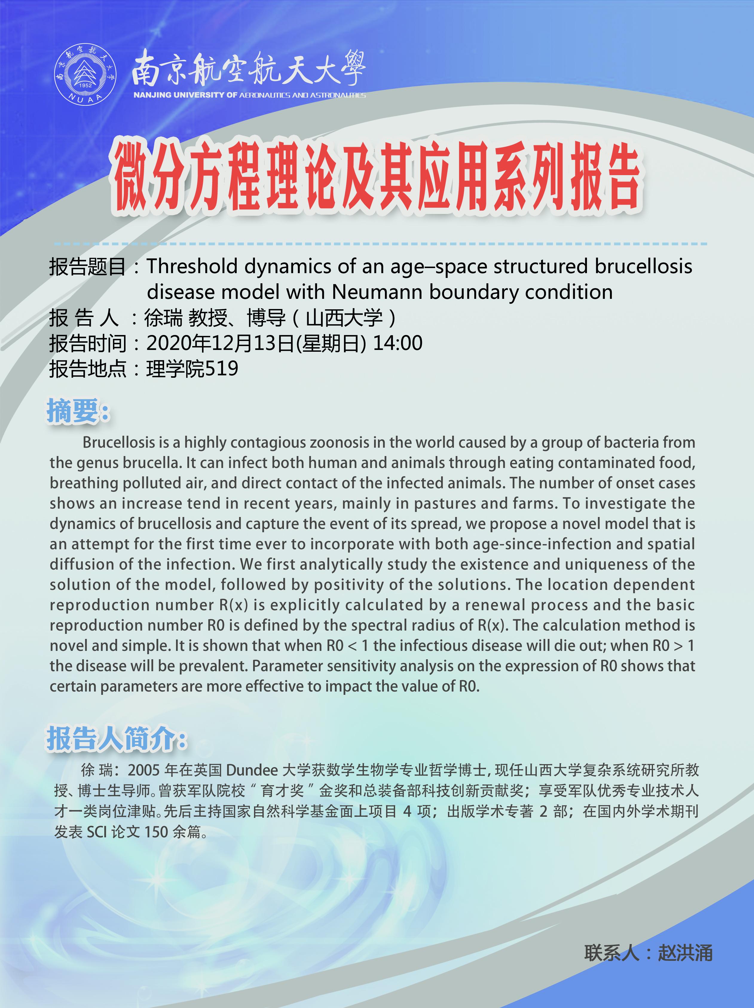 报告题目:Threshold dynamics of an age-space structured brucellosis disease model with Neumann boundary condition