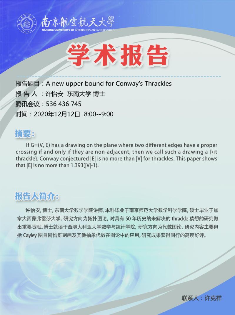 报告题目:A new upper bound for Conway's Thrackles
