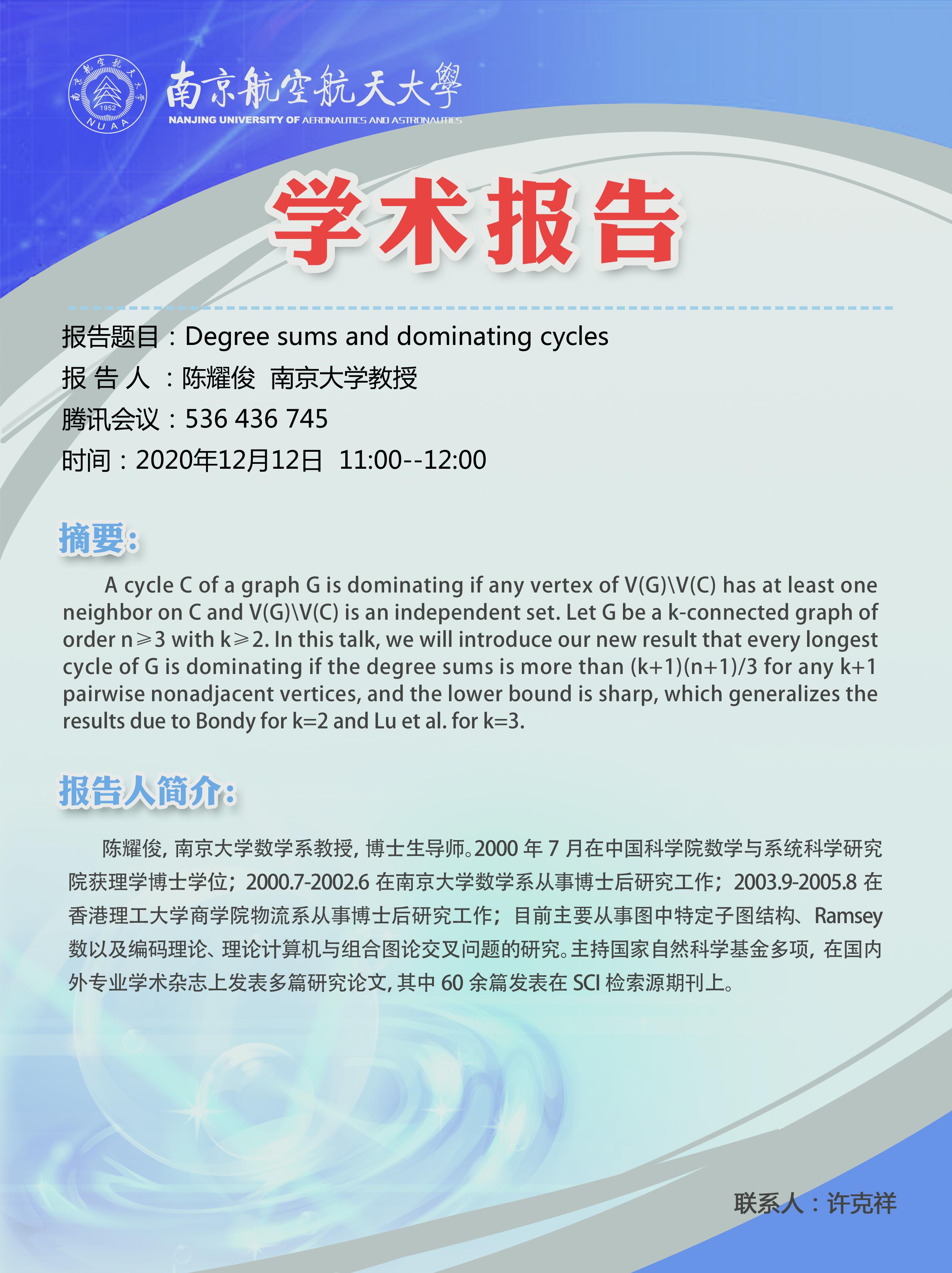 报告题目:Degree sums and dominating cycles