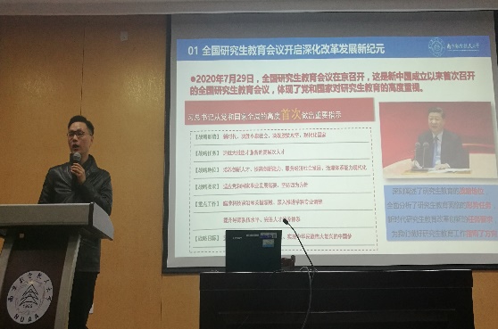 第三阶段是相关政策解读和心理健康培训,党委研究生工作部部长张启钱以“落实立德树人根本任务,培养担当民族复兴大任的时代新人”和“提高研究生招生质量,助力学校‘双一流’建设”,研究生院副院长郑祥明以“明使命,守规范,做新时代优秀导师”,研究生院副院长王英以“导师岗位管理与学位论文质量”,党委研究生工作部副部长王亚彤以“研究生教育管理工作现状及问题分析”,校心理健康教育中心杨雪花主任以“研究生的心理健康状况及主要的心理卫生问题”为主题分别进行了培训。