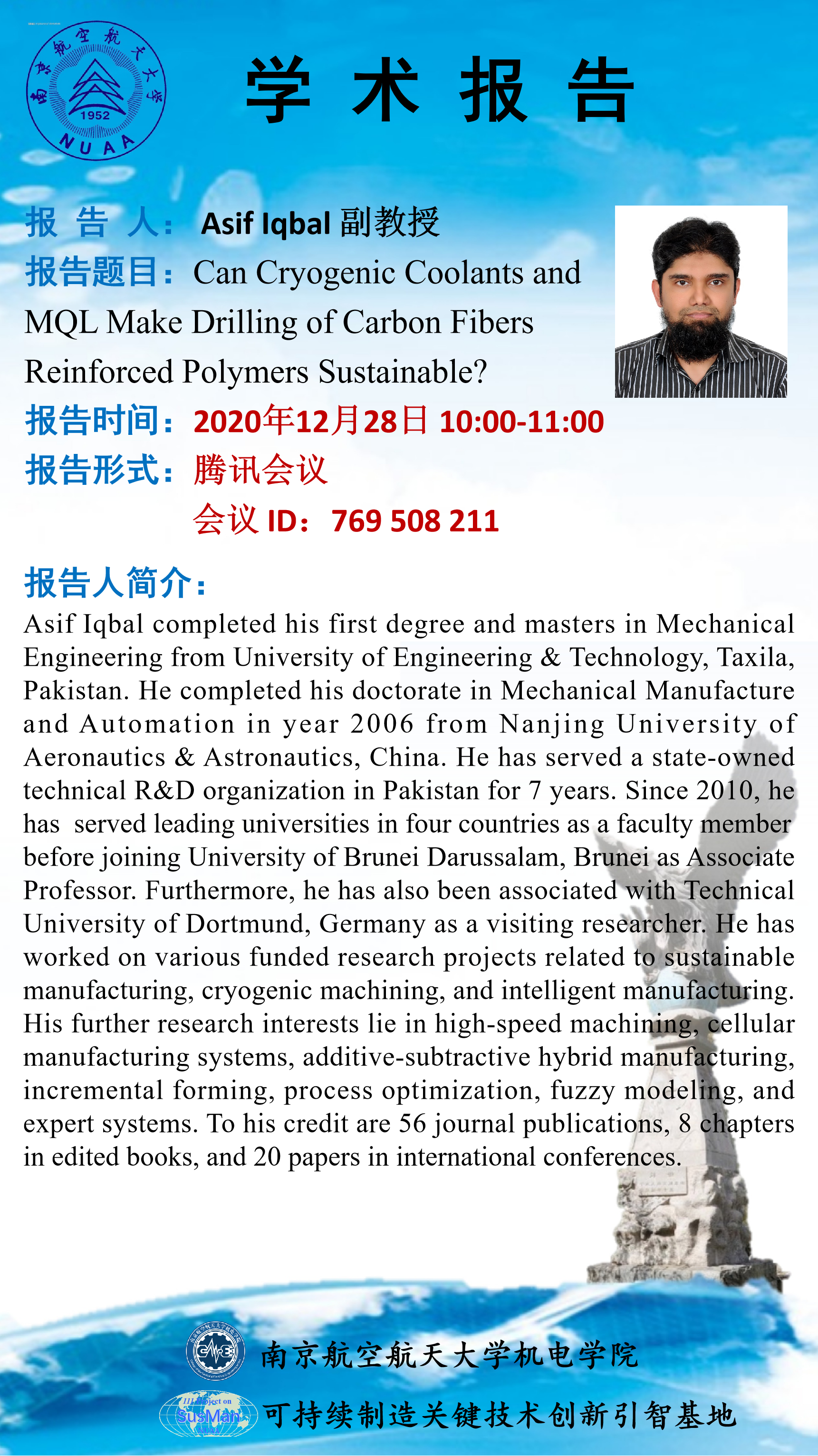 报告题目:Can Cryogenic Coolants and MQL Make Drilling of Carbon Fibers Reinforced Polymers Sustainable?