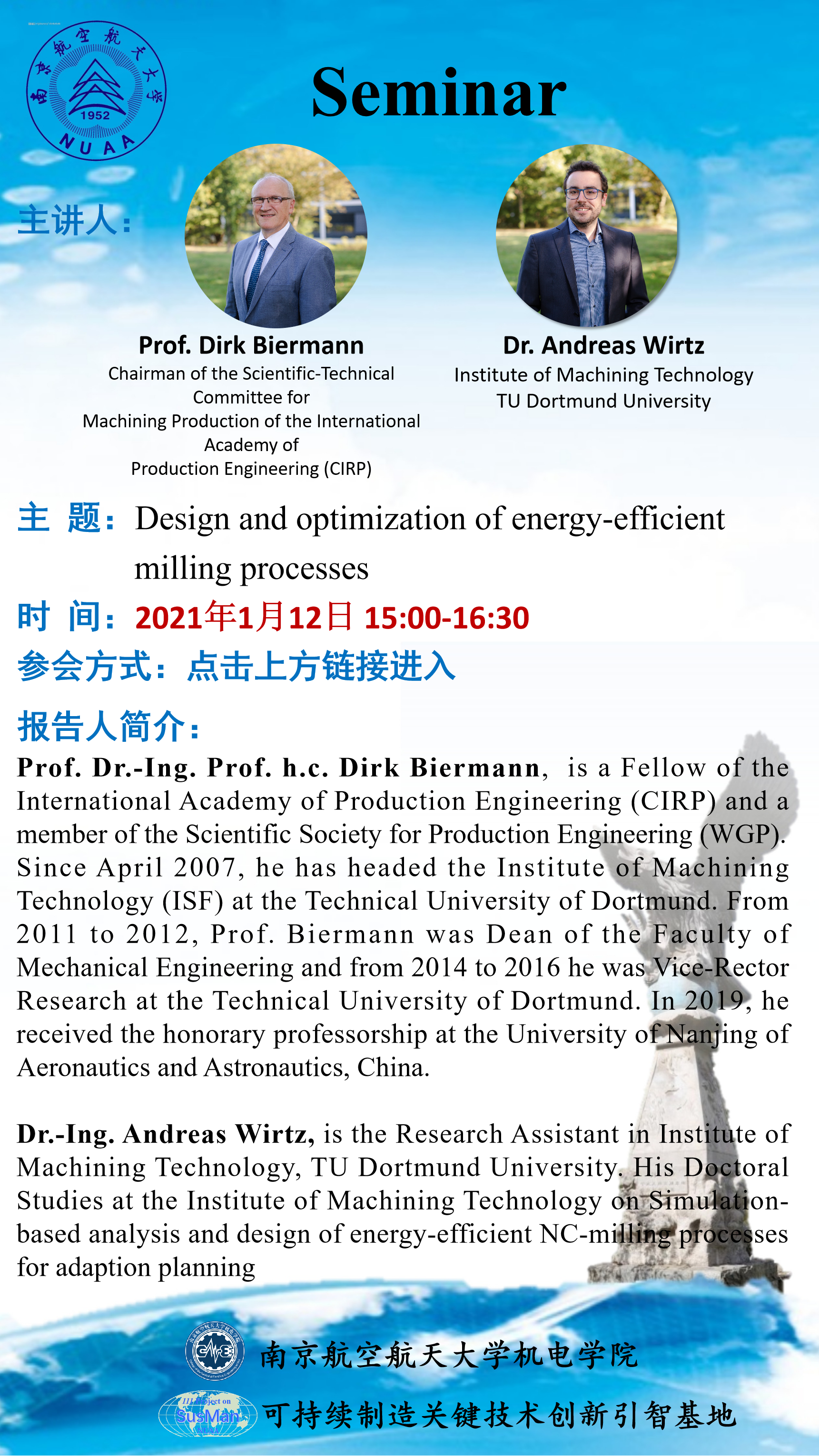 报告人:Dirk Biermann 教授(国际生产工程科学院) Andreas Wirtz 博士(多特蒙德工业大学)