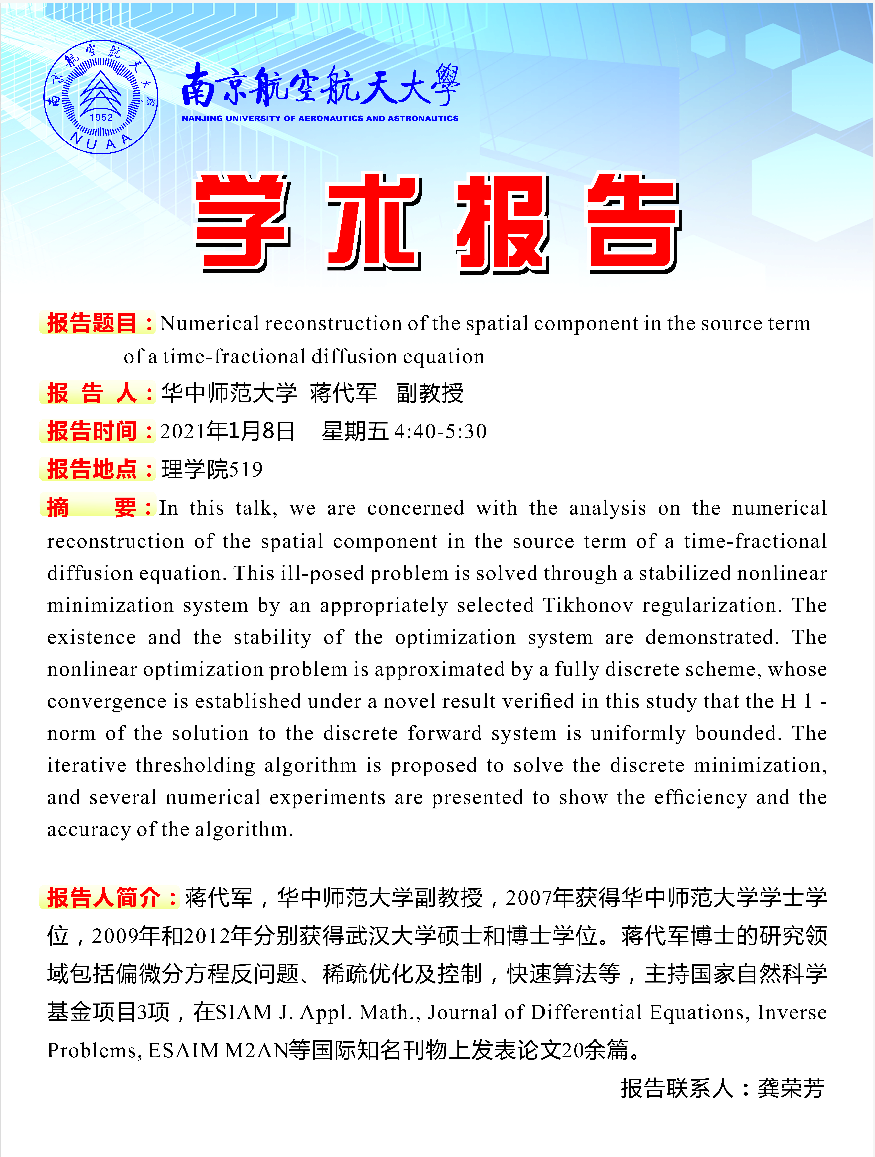 报告题目:Numerical reconstruction of the spatial component in the source term of a time-fractional diffusion equation
