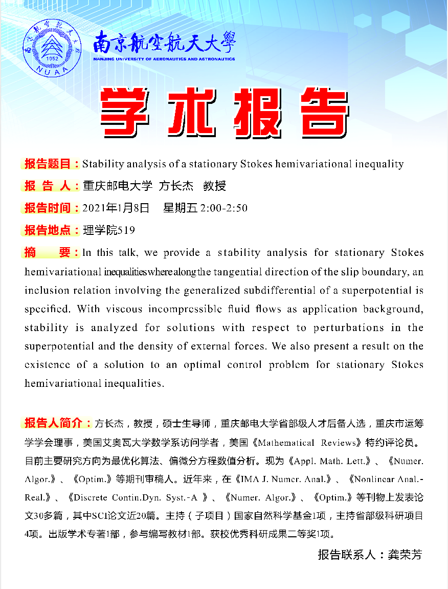 报告题目:Stability analysis of a stationary Stokes hemivariational inequality