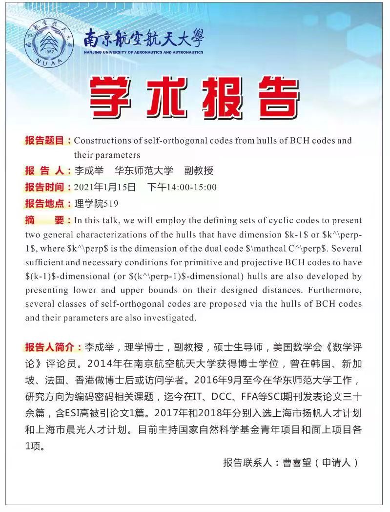 报告题目:Constructions of self-orthogonal codes from hulls of BCH codes and their parameters