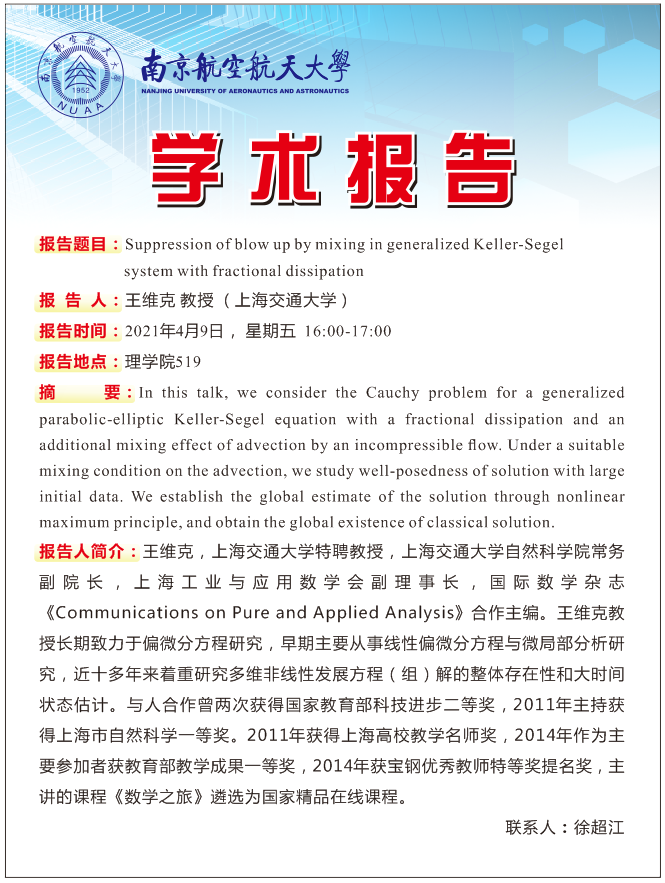 报告题目:Suppression of blow up by mixing in generalized Keller-Segel system with fractional dissipation