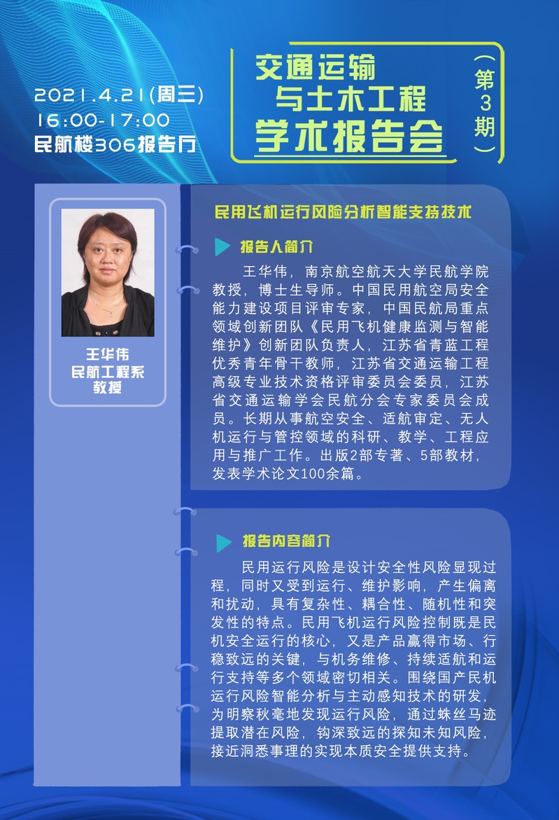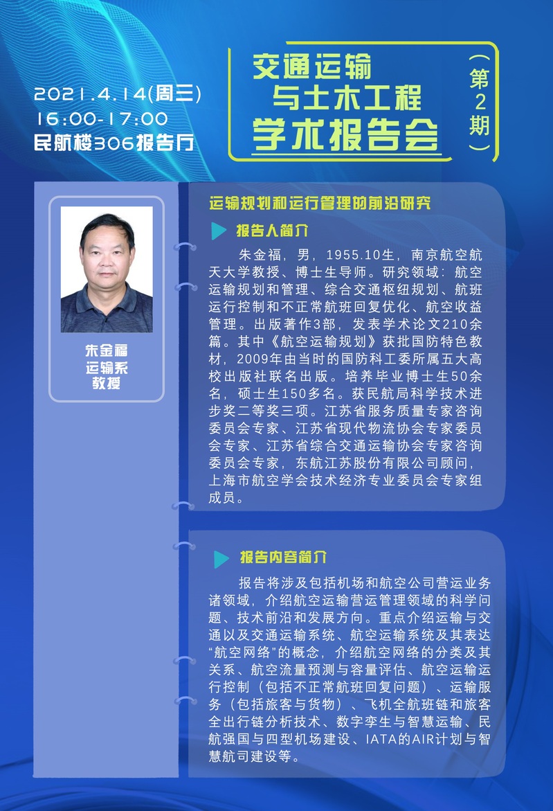 报告将涉及包括机场和航空公司营运业务诸领域,介绍航空运输营运管理领域的科学问题、技术前沿和发展方向。重点介绍运输与交通以及交通运输系统、航空运输系统及其表达“航空网络”的概念,介绍航空网络的分类及其关系、航空流量预测与容量评估、航空运输运行控制(包括不正常航班回复问题)、运输服务(包括旅客与货物)、飞机全航班链和旅客全出行链分析技术、数字孪生与智慧运输、民航强国与四型机场建设、IATA的AIR计划与智慧航司建设等。