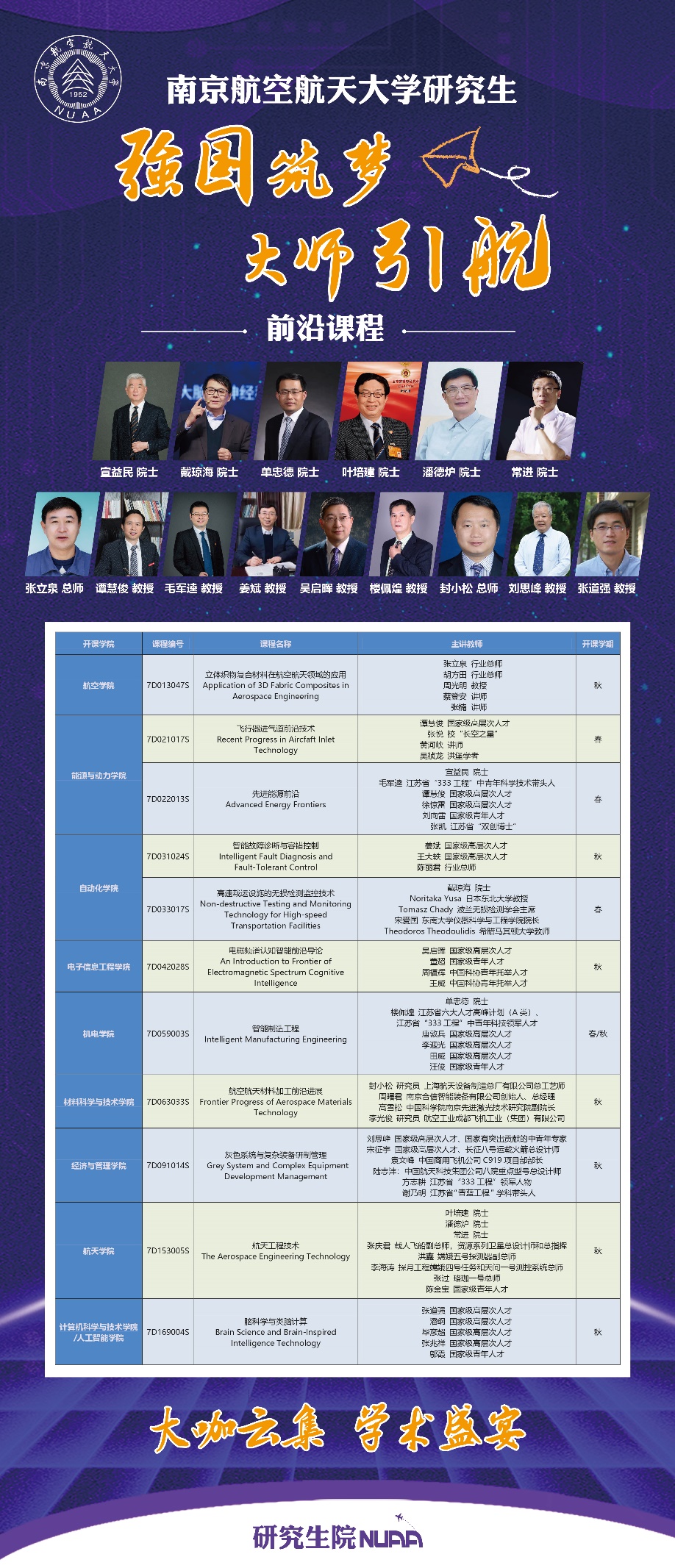 研究生“强国筑梦·大师引航”系列课程由研究生院组织,是面向我校研究生创立的由院士、杰青、长江、名师、行业总师等国家级人才领衔授课的高层次研究生前沿课程,旨在通过“大师—大课”的形式,给全校师生带来学术盛宴,引导我校广大研究生坚定理想信念、了解学科前沿、拓展学术视野、提升科学精神和创新能力。