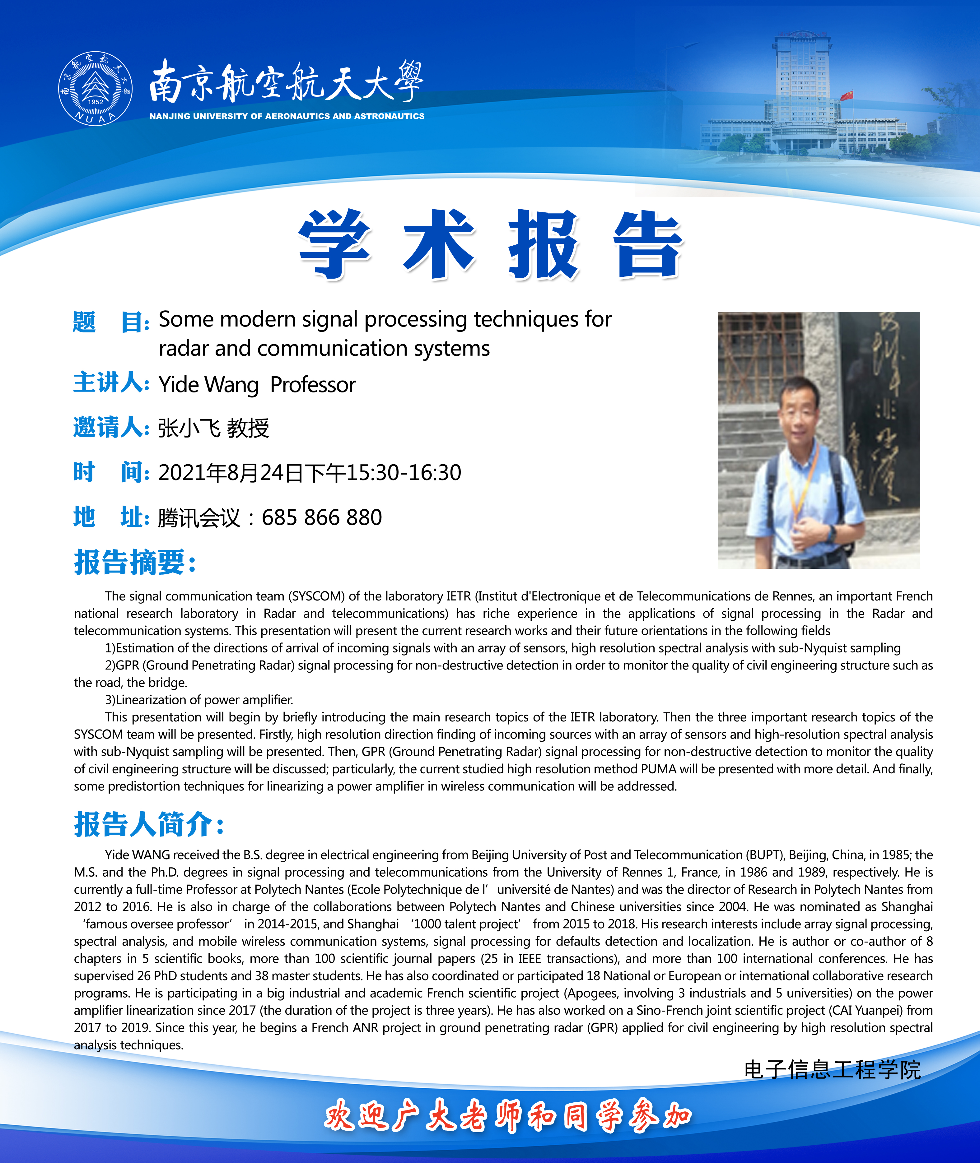报告题目:Some modern signal processing techniques for radar and communication systems