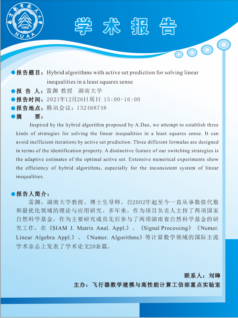 报告题目:Hybrid algorithms with active set prediction for solving linear inequalities in a least squares sense