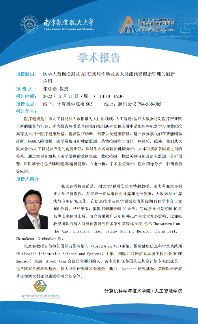 报告题目:医学大数据挖掘及AI在疾病诊断及病人监测预警健康管理的创新应用