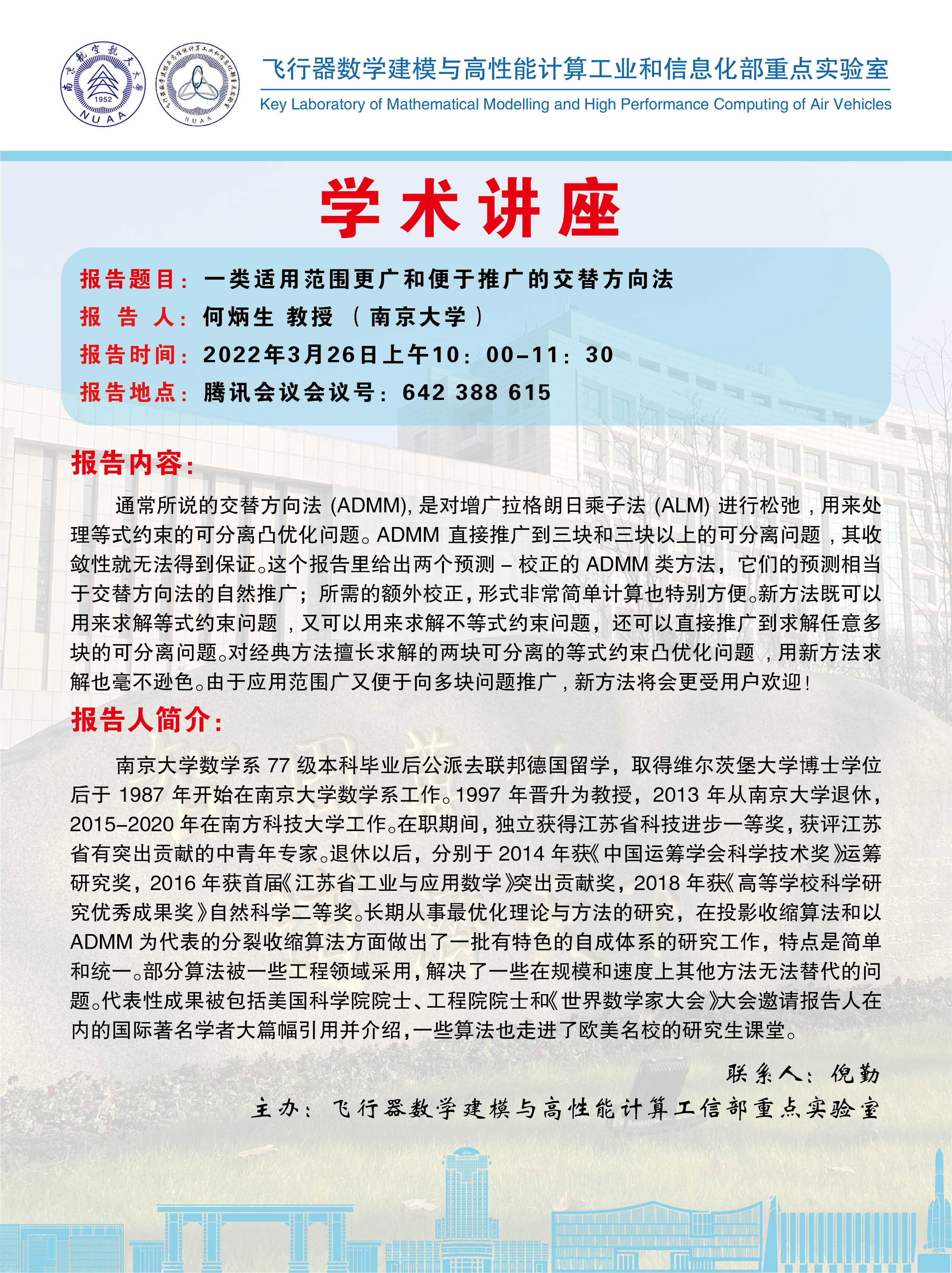 报告题目:一类适用范围更广和便于推广的交替方向法