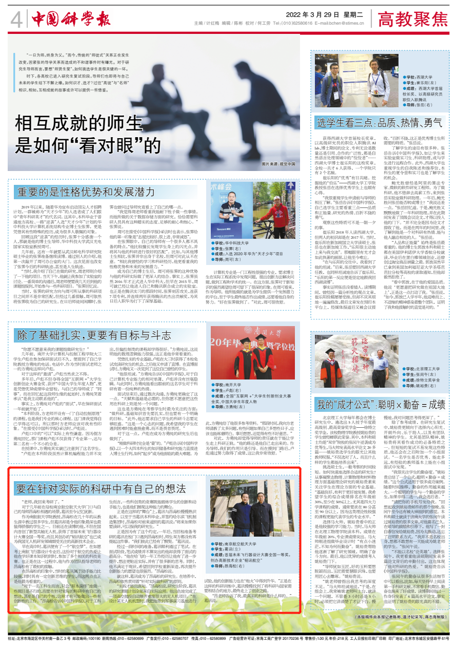 编者按:3月29日,《中国科学报》聚焦导师与学生之间的关系,推出系列报道《相互成就的师生是如何“看对眼”的》,邀请我校航空学院教授昂海松与其学生葛讯,讲述师生之间相识、相知并相互成就的师生故事。现转发全文如下: