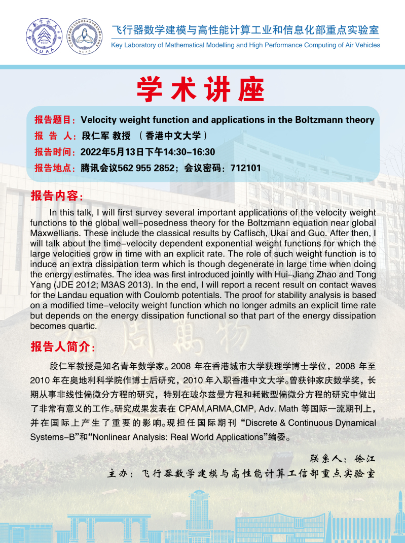 报告题目:Velocity weight function and applications in the Boltzmann theory