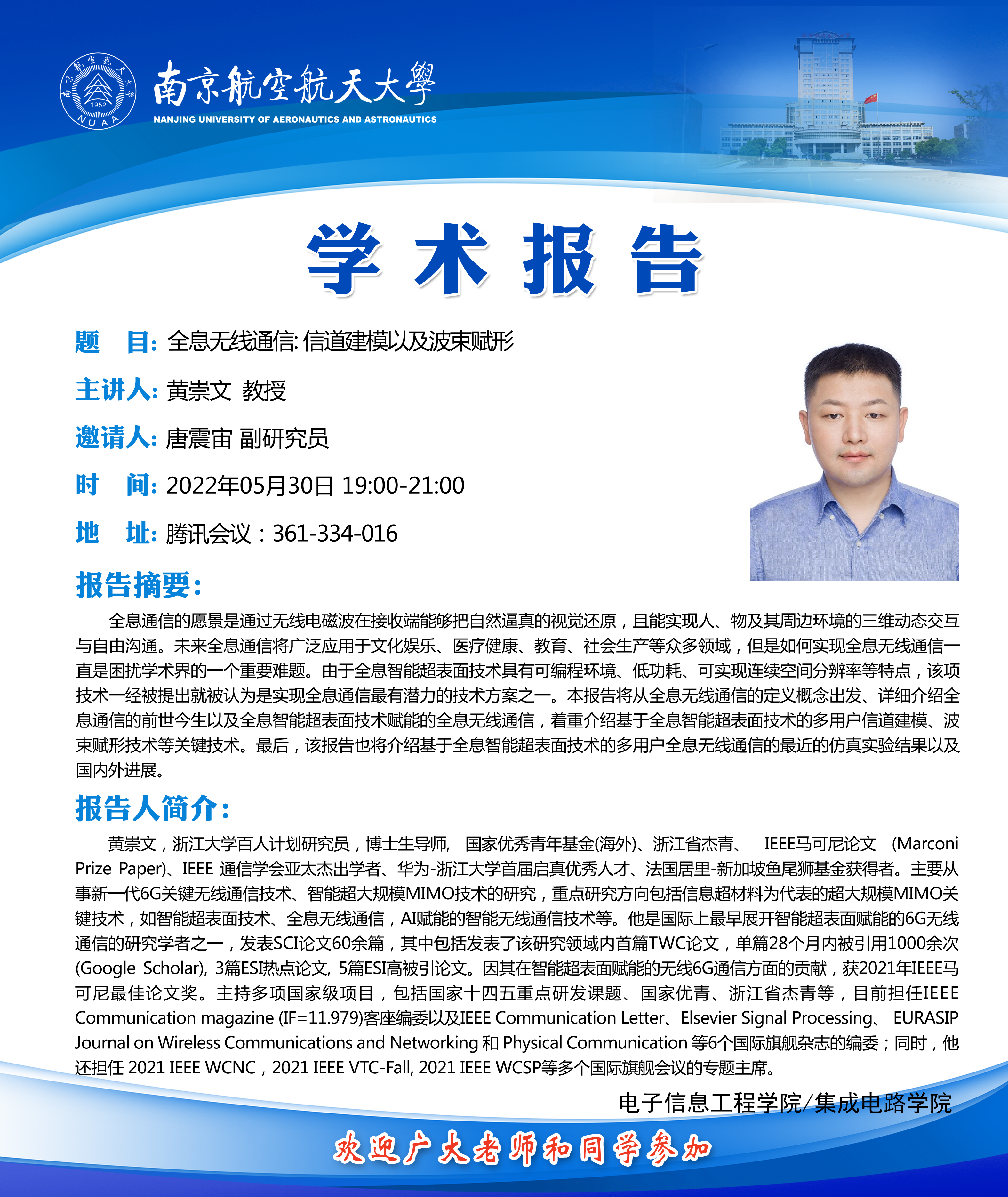 报告题目:全息无线通信: 信道建模以及波束赋形