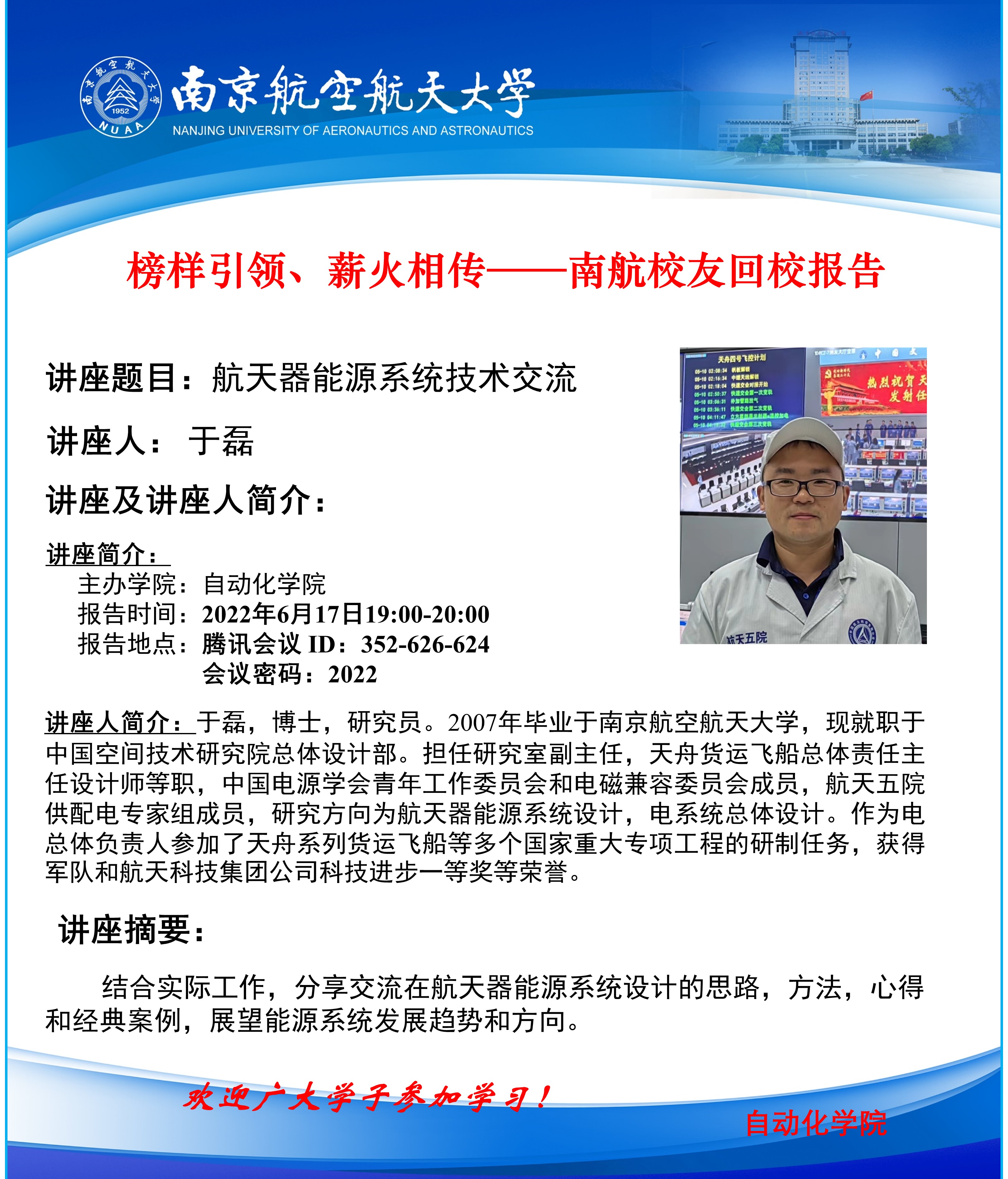报告题目:南航校友回校报告——航天器能源系统技术交流