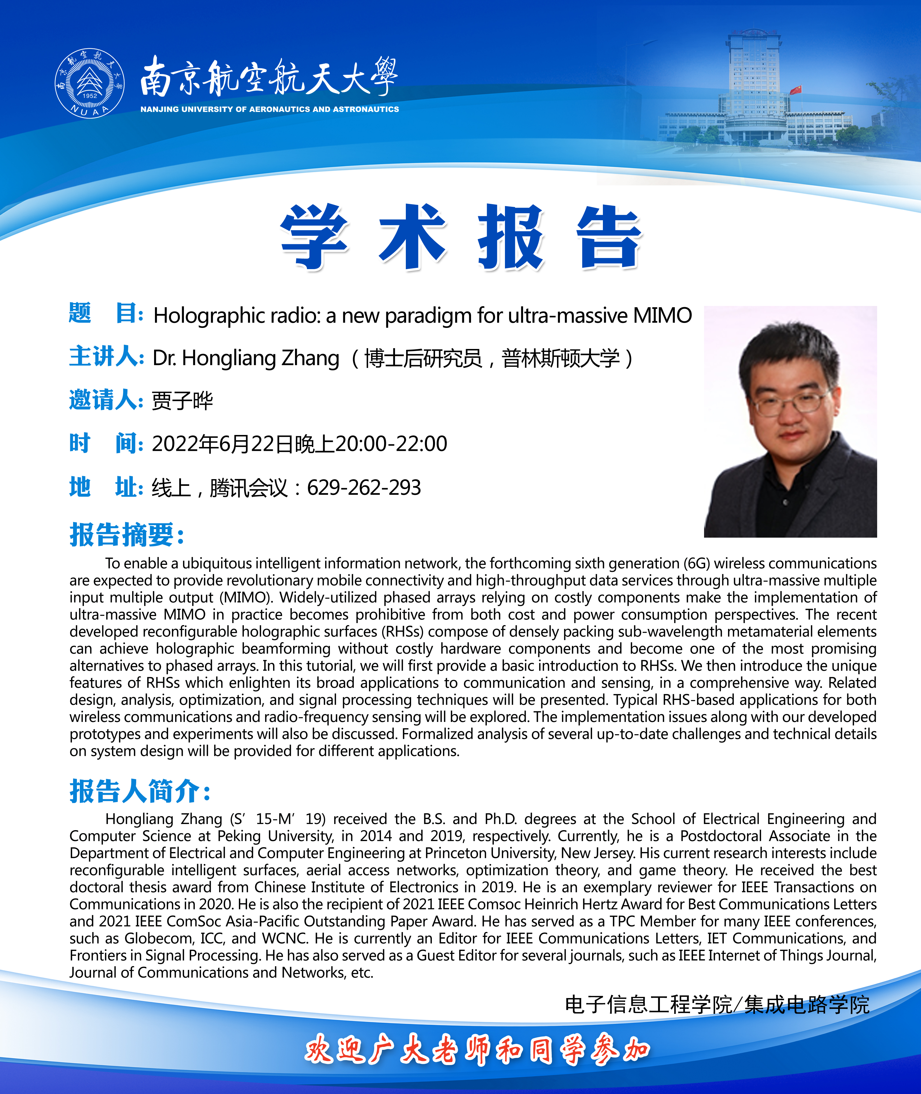 报告题目:Holographic radio:a new paradigm for ultra-massive MIMO
