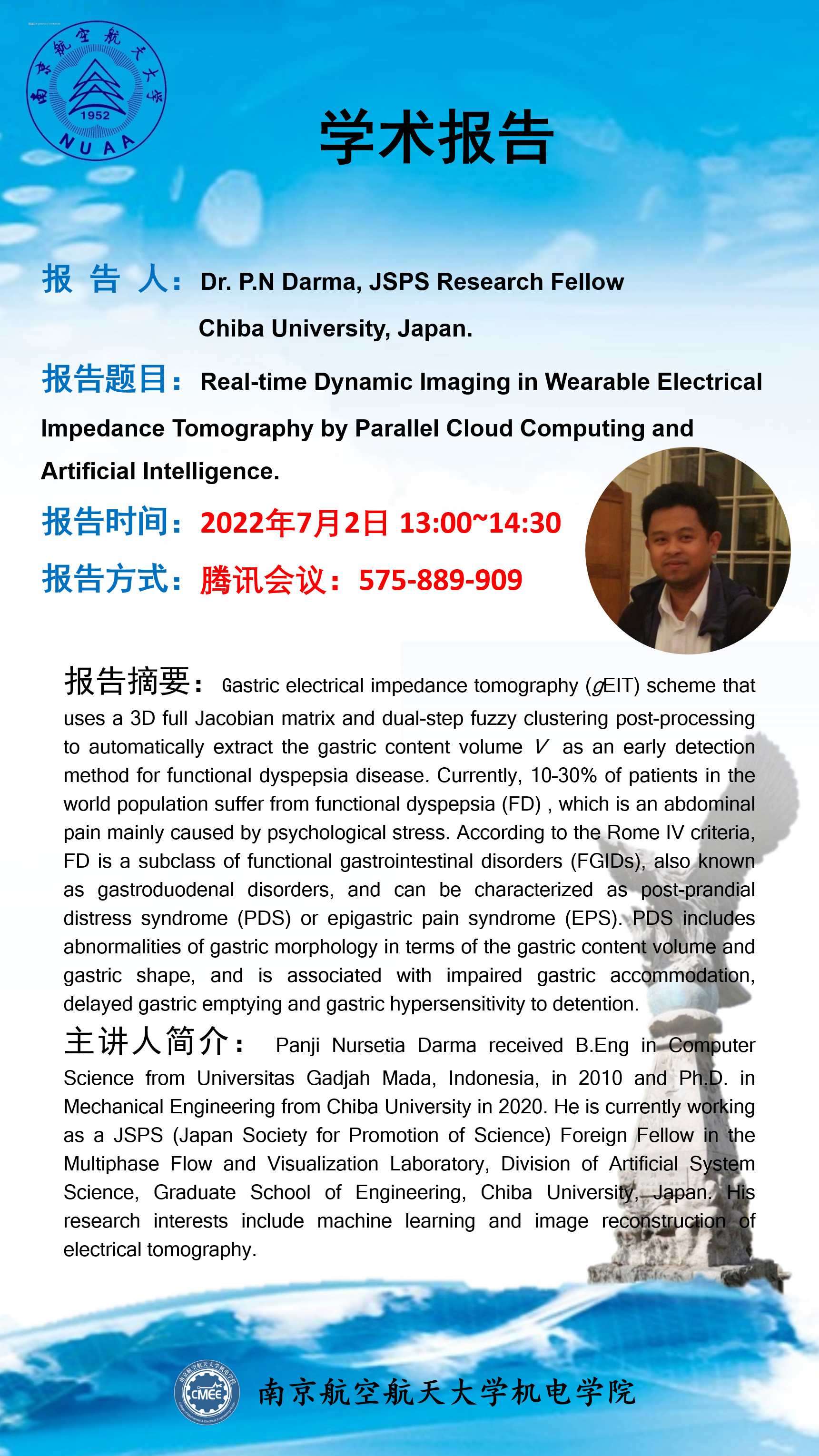 报告题目:Real-time Dynamic Imaging in Wearable Electrical Impedance Tomography by Parallel Cloud Computing and Artificial Intelligence.