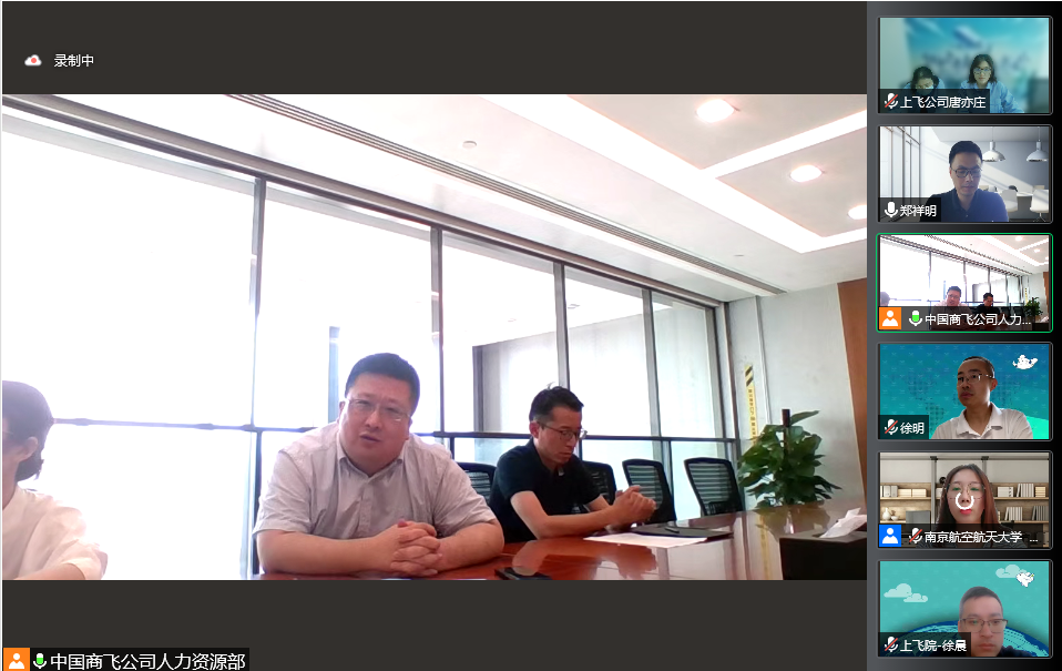 7月28日,第二届南航-商飞“大飞机班”举行线上面试选拔。中国商用飞机有限责任公司人力资源部副部长宁方明、人力资源部人才发展处处长徐明参加此次面试,上飞院、上飞公司、试飞中心、上航公司4位企业专家担任此次面试的评委。