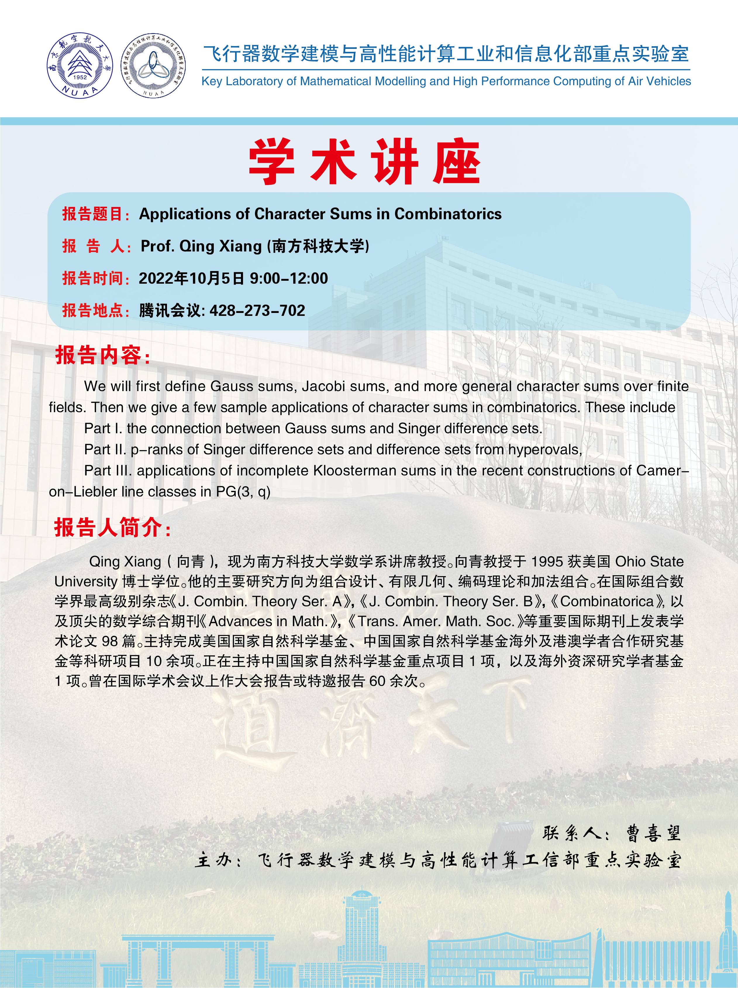 报告题目:Applications of Character Sums in Combinatorics