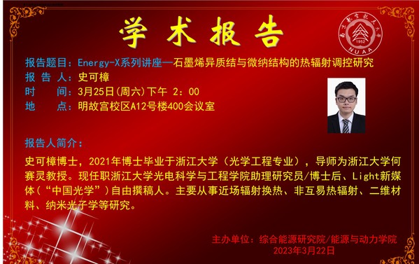 报告题目:Energy-X系列讲座—石墨烯异质结与微纳结构的热辐射调控研究