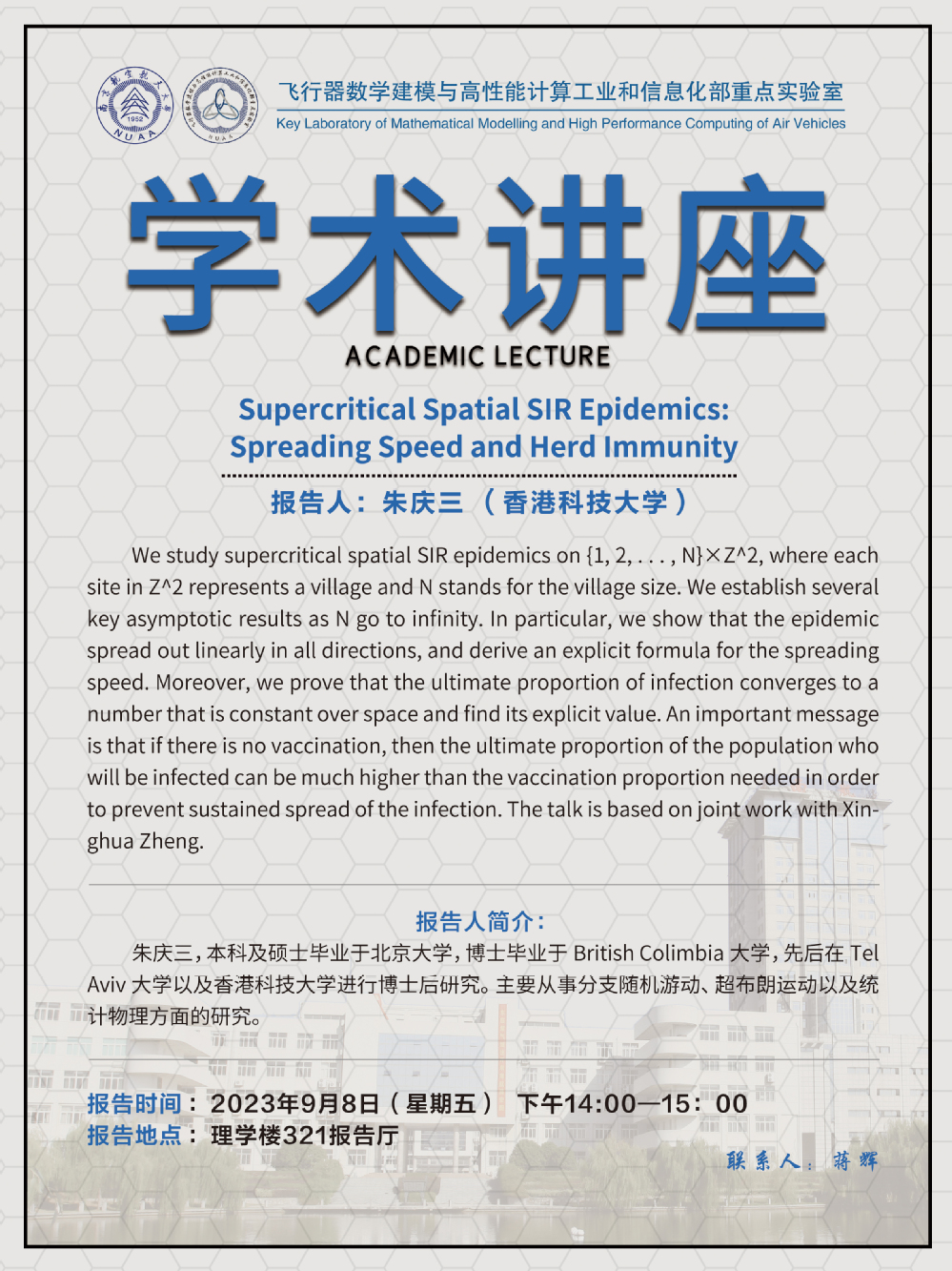 报告题目:Supercritical Spatial SIR Epidemics:Spreading Speed and Herd lmmunit!