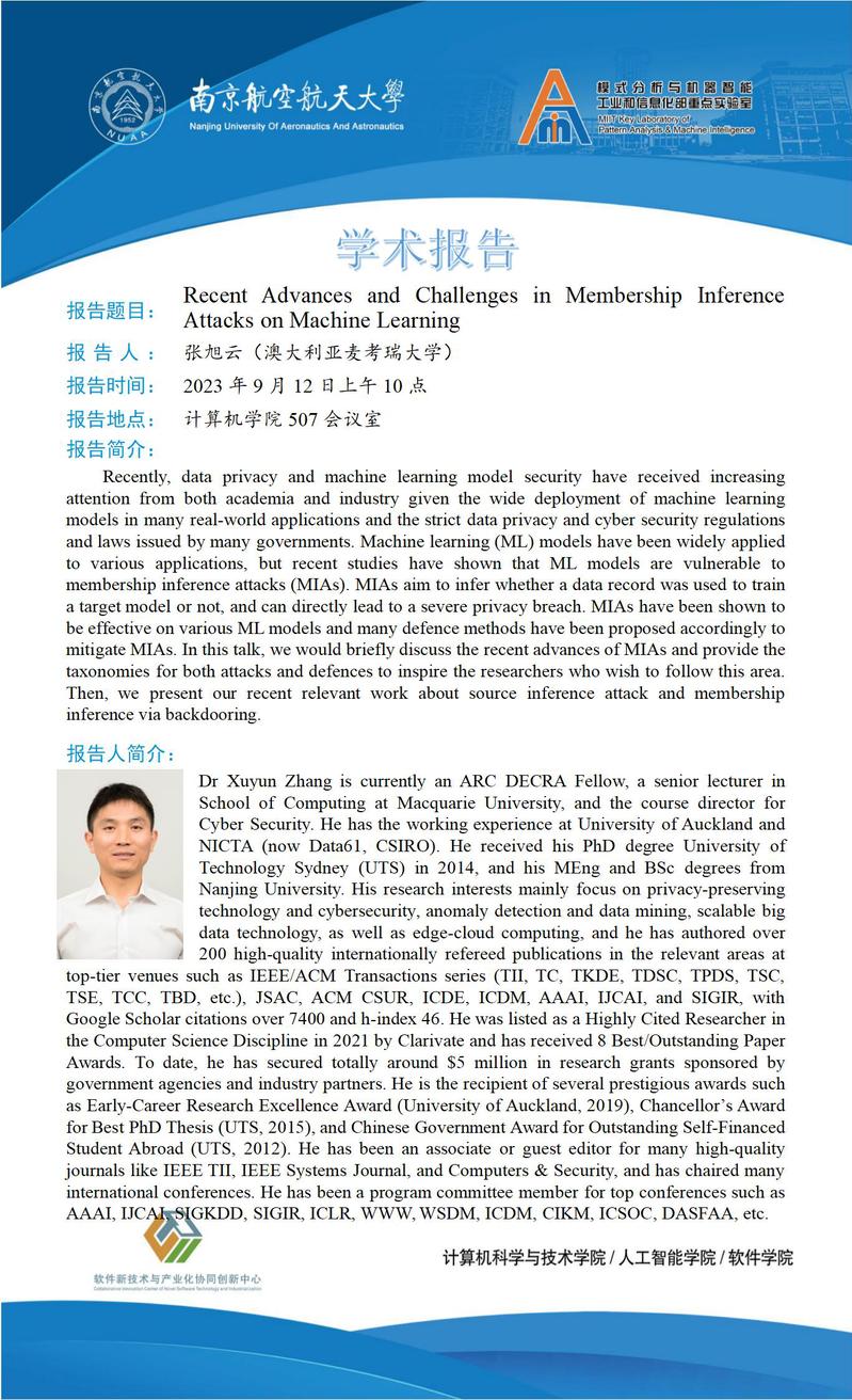 报告题目:Recent Advances and Challenges in Membership Inference Attacks on Machine Learning