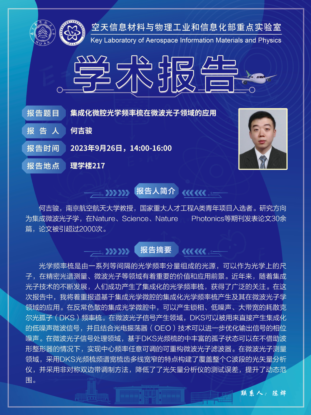 报告题目:集成化微腔光学频率梳在微波光子领域的应用