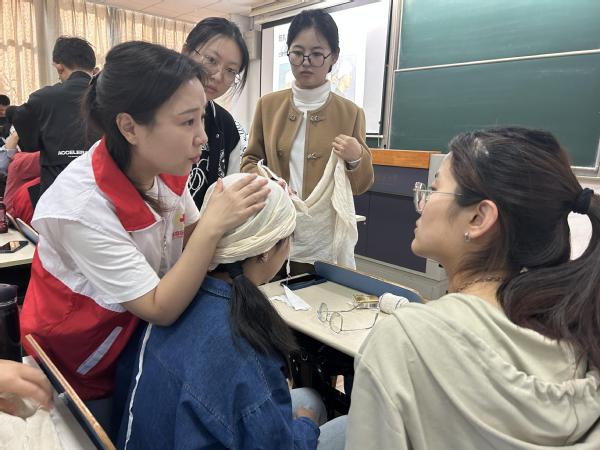 第二环节是创伤救护培训,其内容包括:止血、包扎、骨折、固定四个方面。培训老师向同学们介绍了应急救援的由来以及实际操作等相关知识。对每一项应急操作项目进行了现场演示,并引导同学们两人一组互相练习实操,有针对性地为操作不熟练、动作不规范的同学耐心讲解。