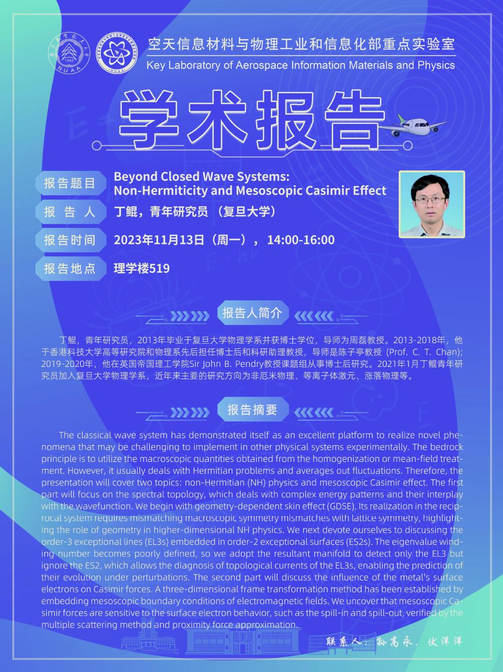 报告题目:Beyong closed wave systems:Non-hermiticity and Mesoscopic Casimir efect