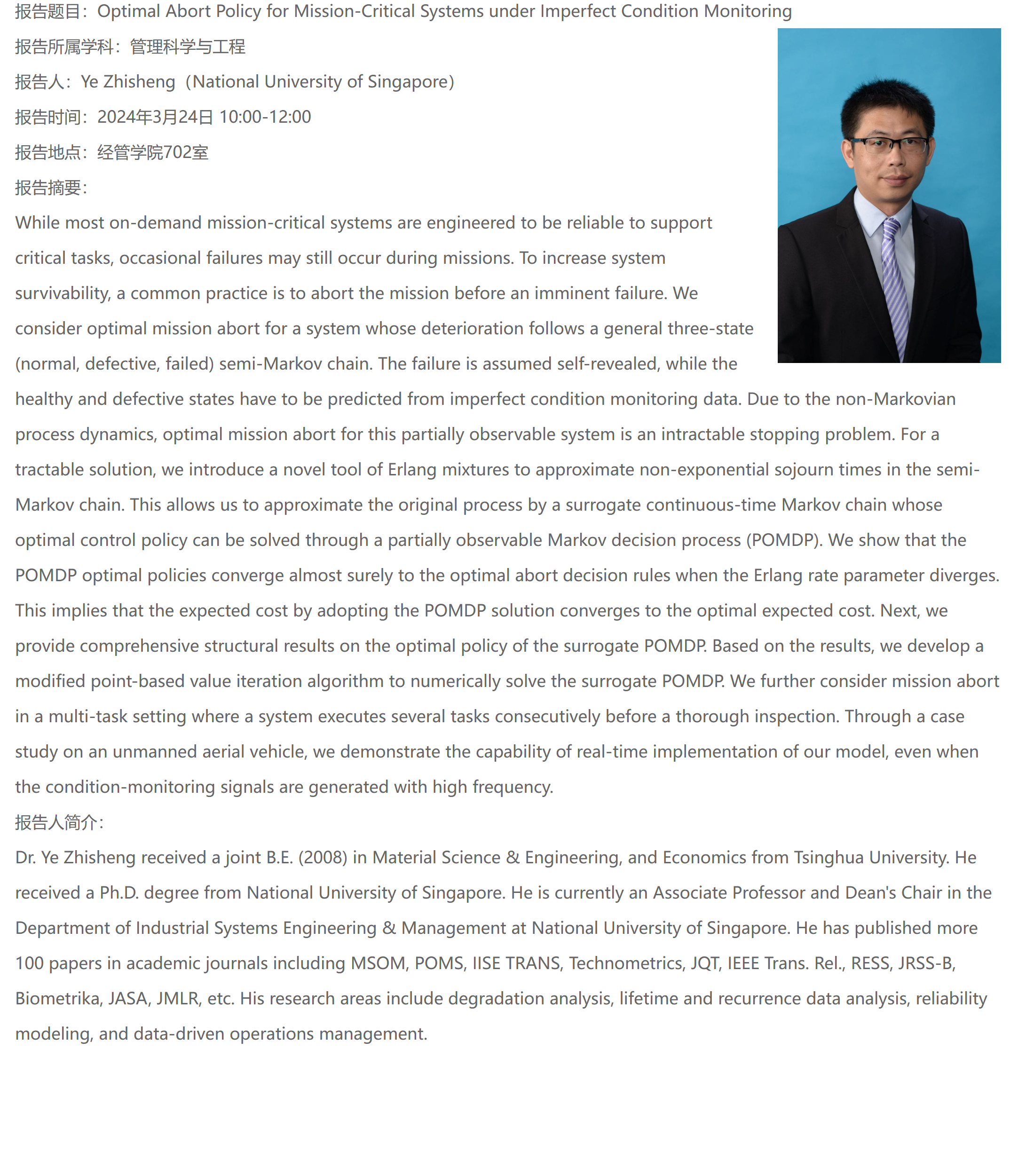 报告题目:Optimal Abort Policy for Mission-Critical Systems under Imperfect Condition Monitoring