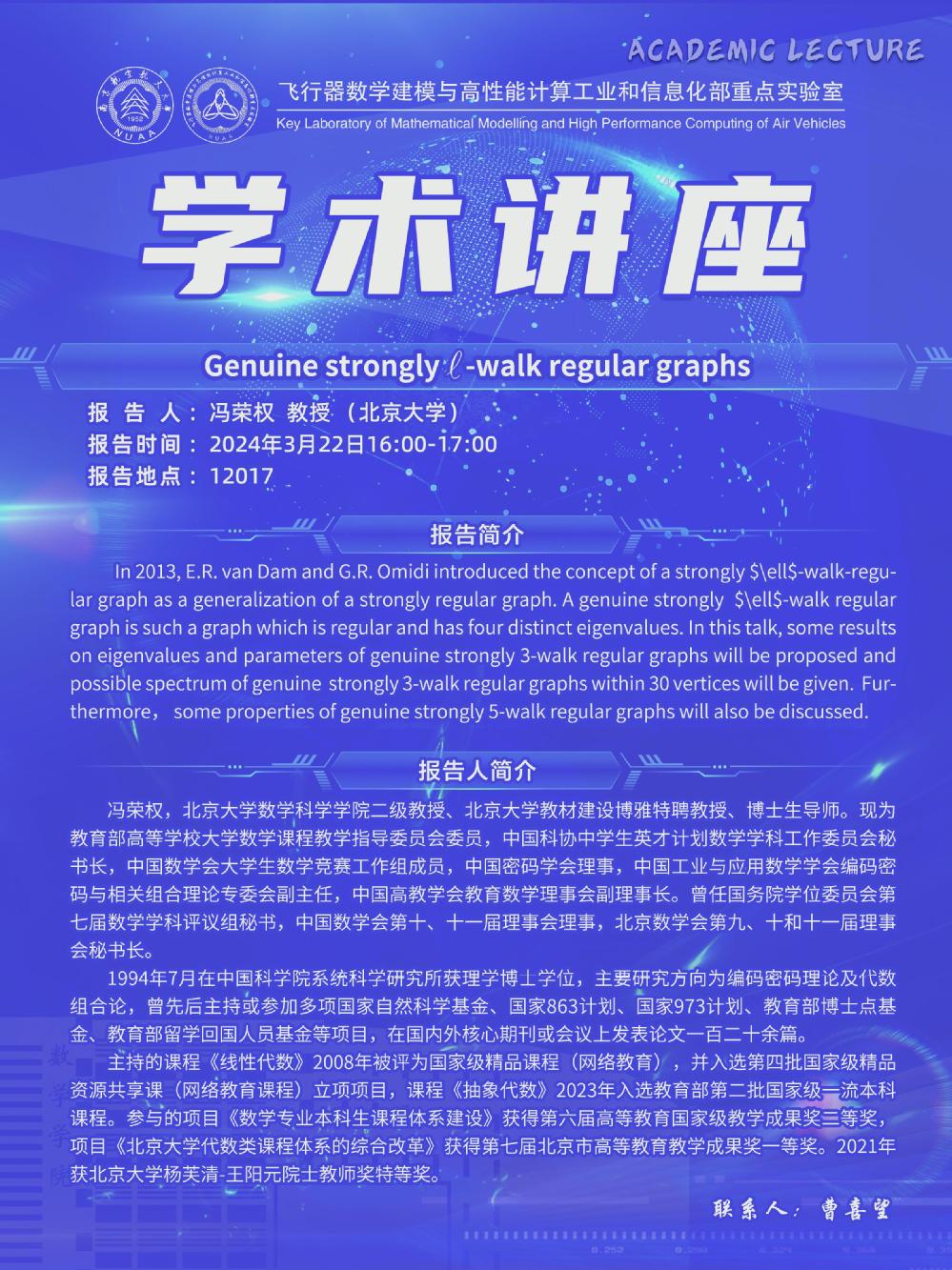 2. 报告题目:Genuine strongly -walk regular graphs