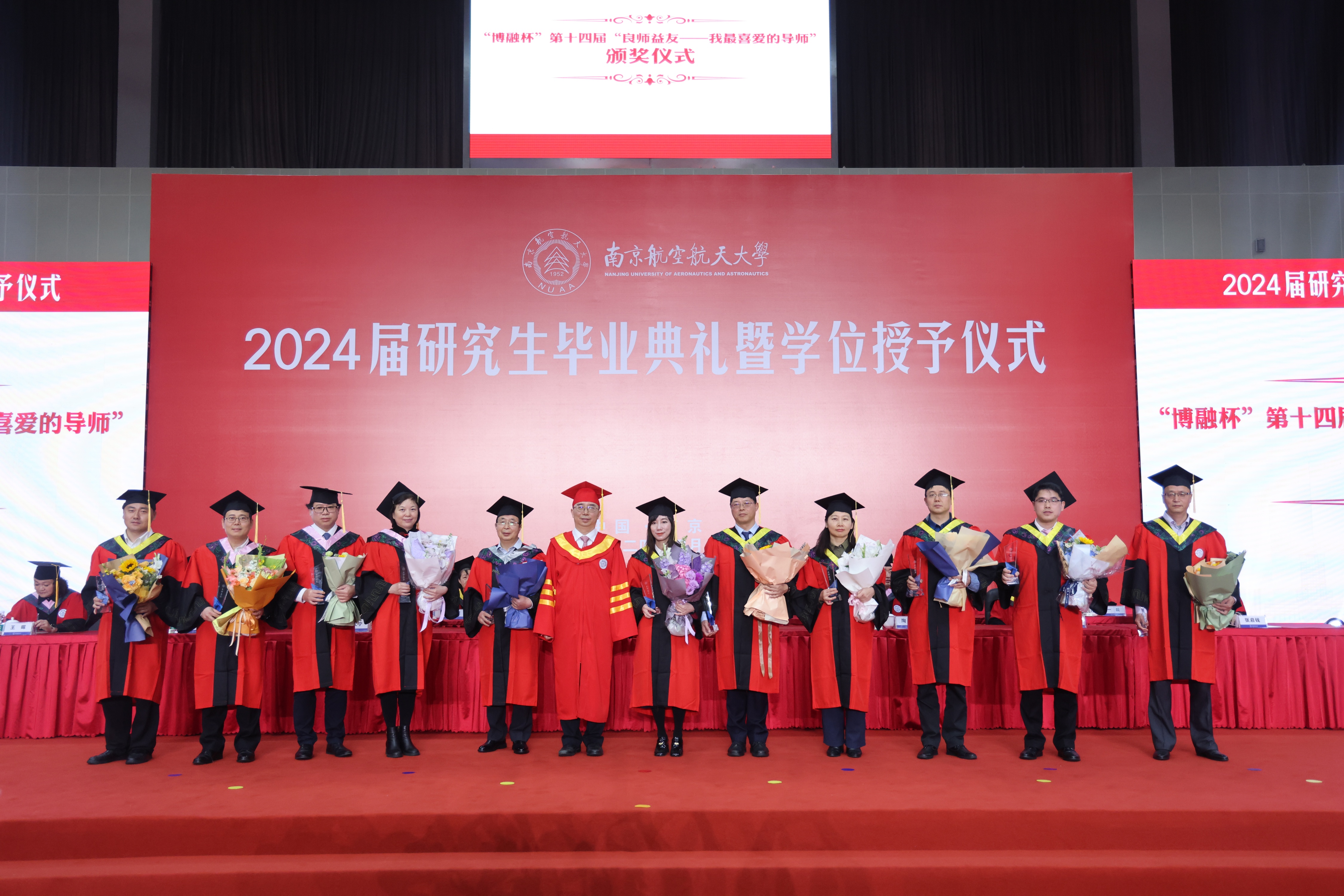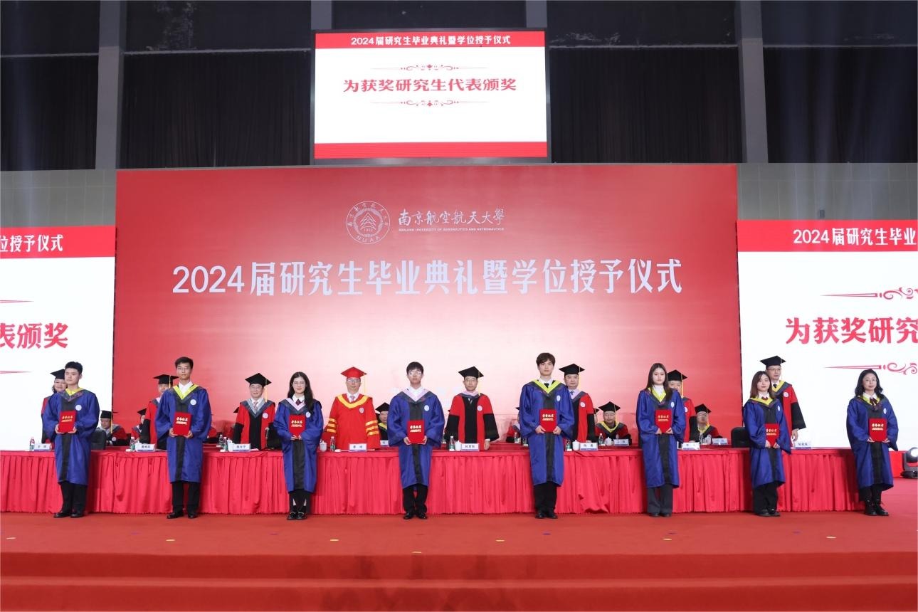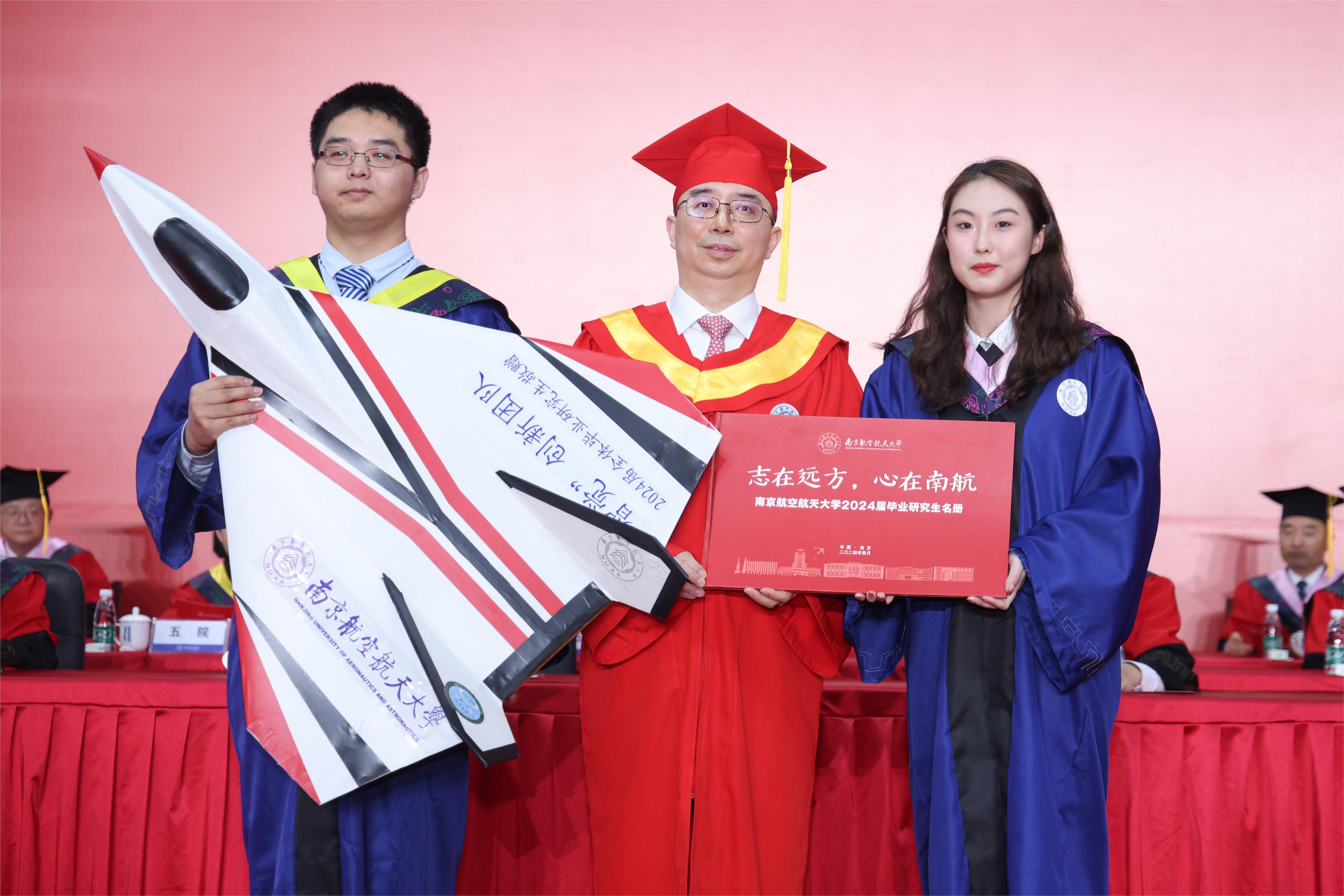 获奖导师、数学学院赵洪涌教授作为研究生导师代表发言。他以数学家的严谨和教育者的温情,结合“感恩、乐观和诚信”三种人生态度,分享了自己在近三十年教书育人过程中的感悟与坚持,寄语全体毕业生:心怀感恩,坚定前行;乐观向上,传递正能量;诚实守信,踏实做事。鼓励毕业生们脚踏实地坚定前行,扬帆起航去书写人生新的篇章。典礼上,南航“智觉”创新团队的张宗源同学和校友大使张凯璇同学代表全体毕业研究生为母校送上了一份特殊的礼物——由南航研究生团队自主研发的飞行器气动载荷感知与运动预测机载系统验证机和2024届毕业研究生名册,展现了南航学子心系母校的情怀与志在远方的理想。姜斌校长代表学校接受毕业生赠礼。