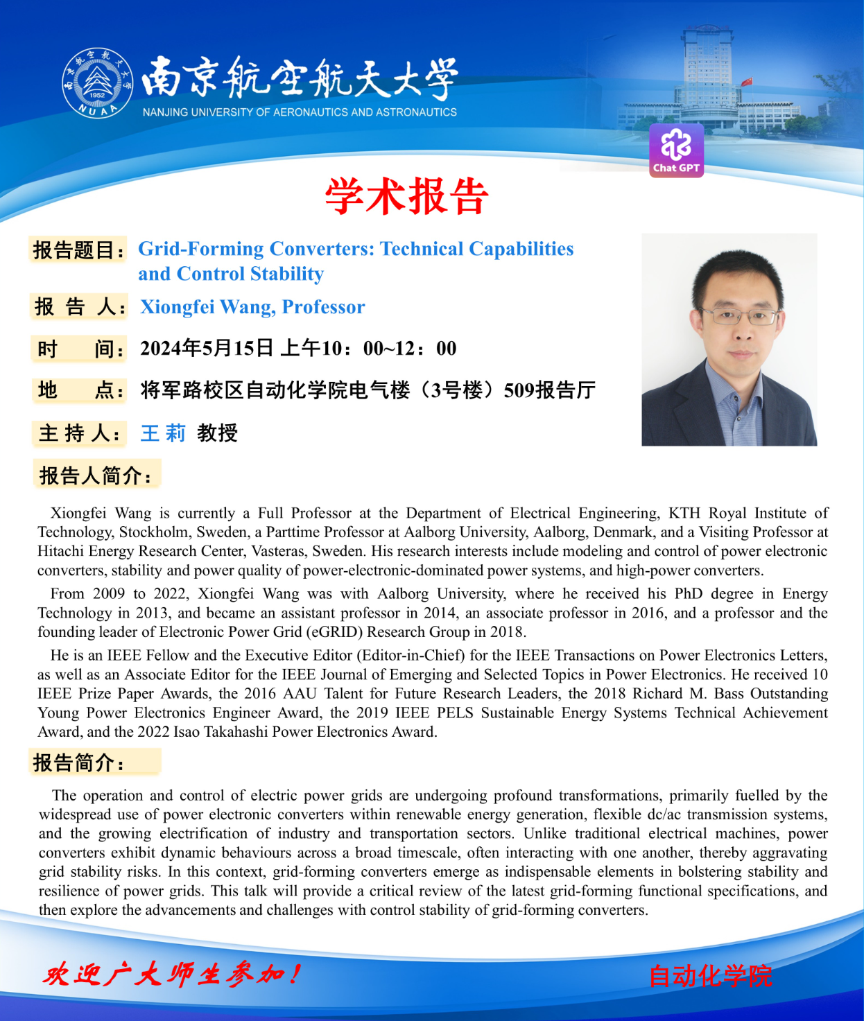 报告地点 : 将军路校区自动化学院电气楼(3号楼)509报告厅