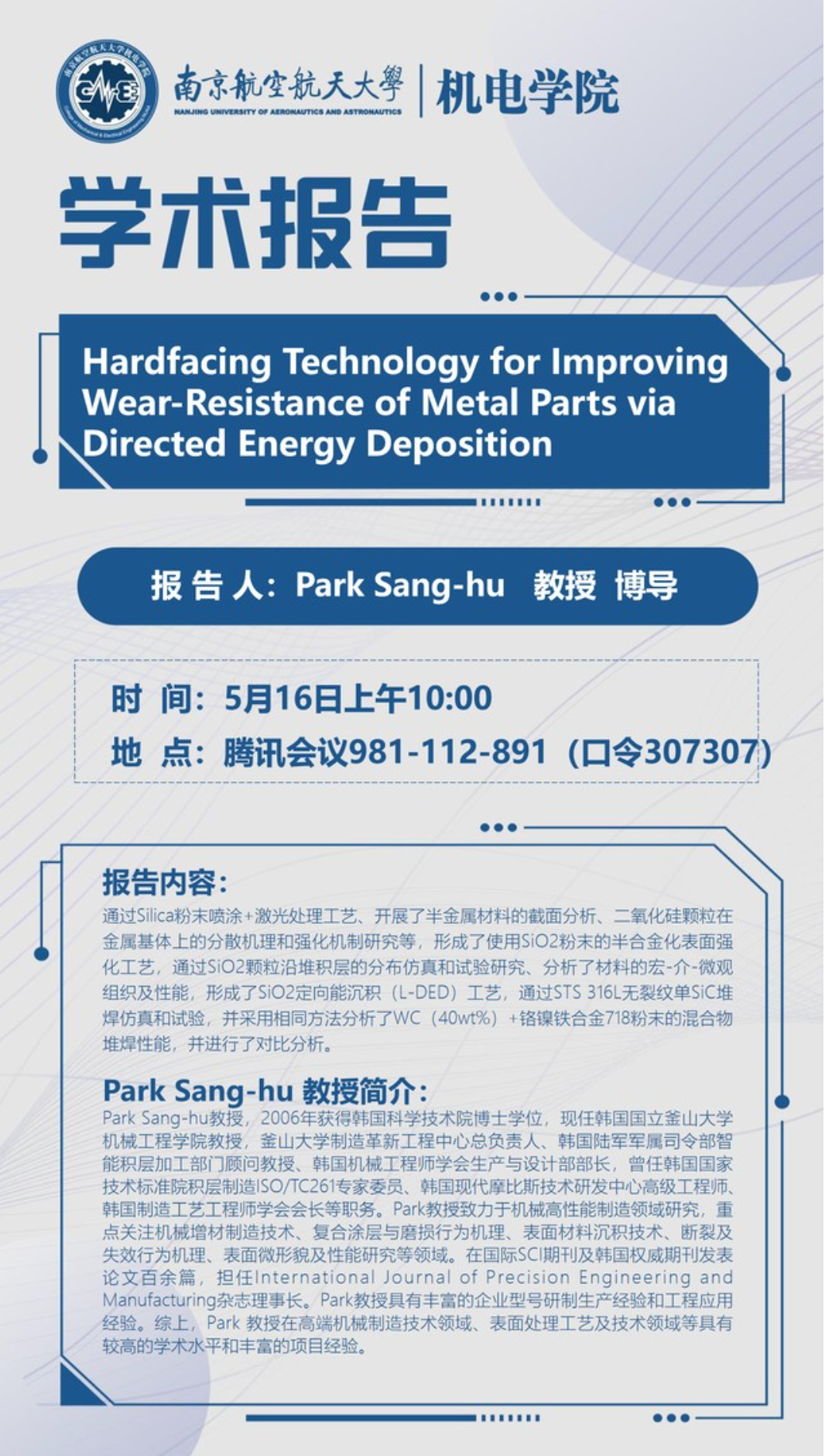 报告地点 : 腾讯会议981-112-891(口令307307)